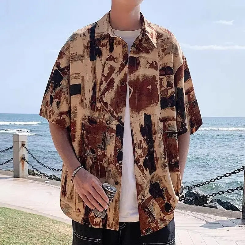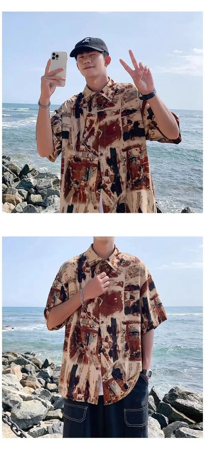 Riolio American high street men and women trendy personalized printed vacation shirts for couples loose beach casual short sleeves y2k