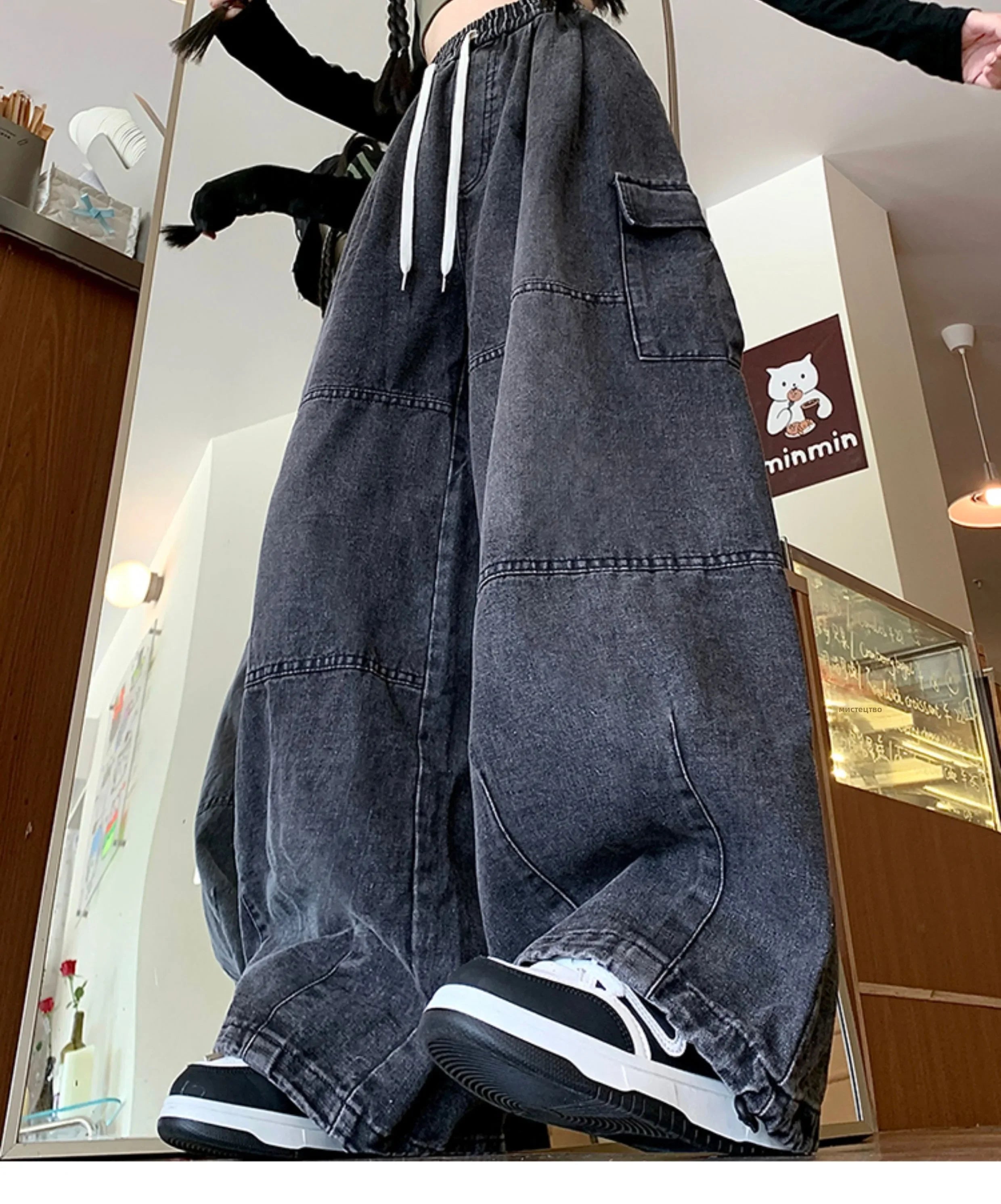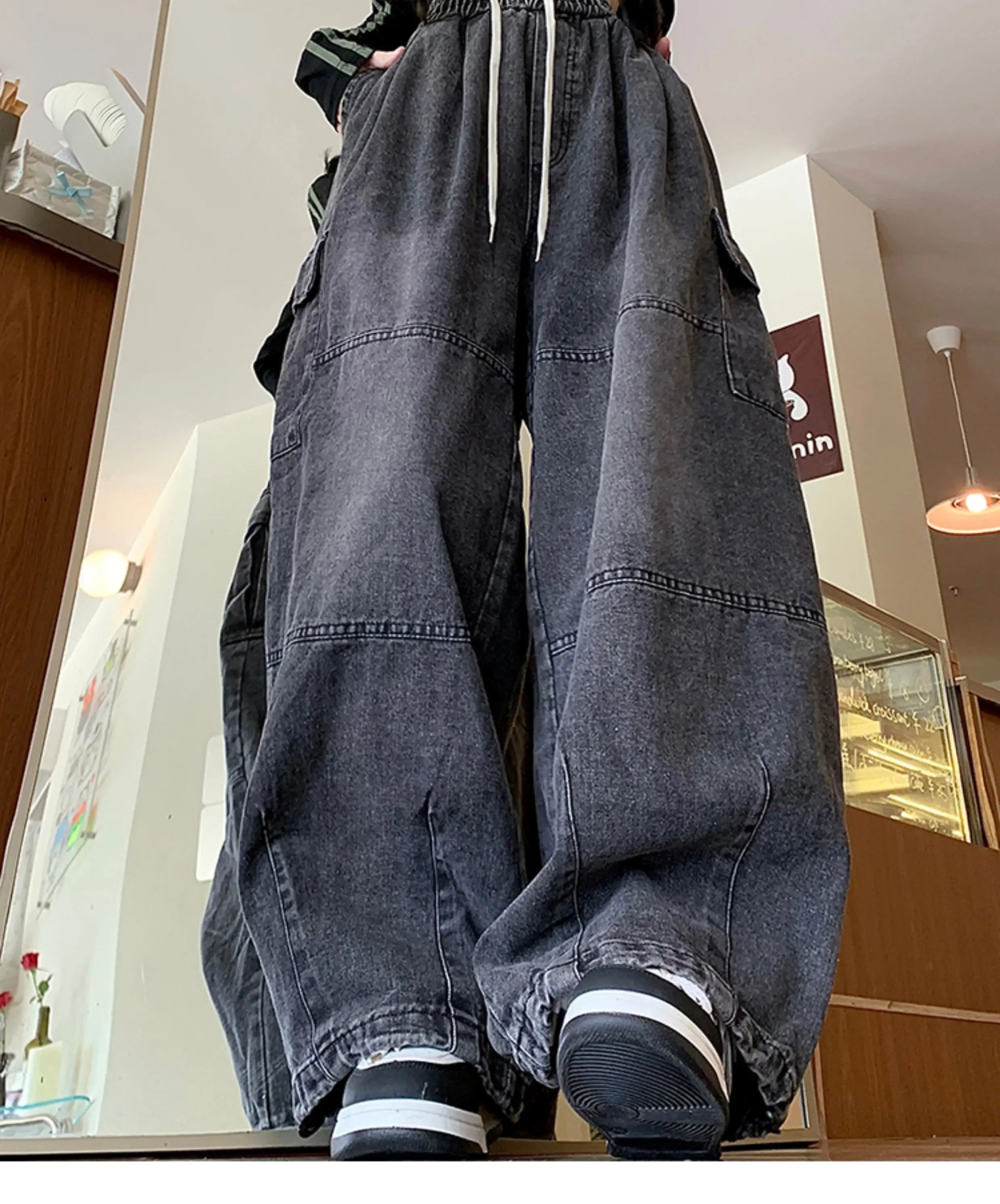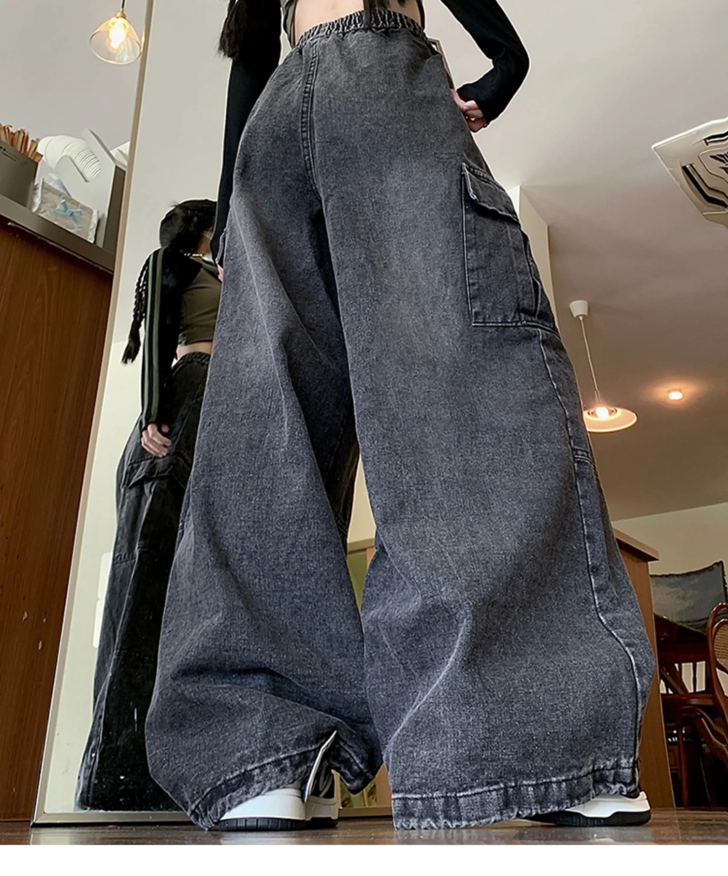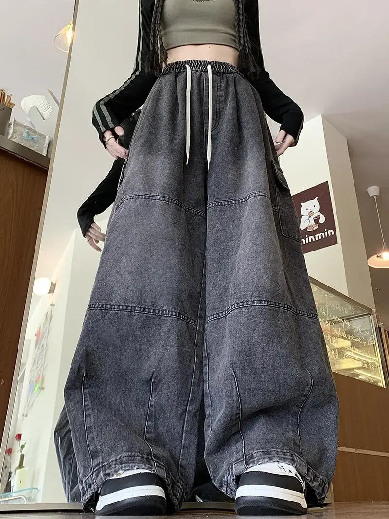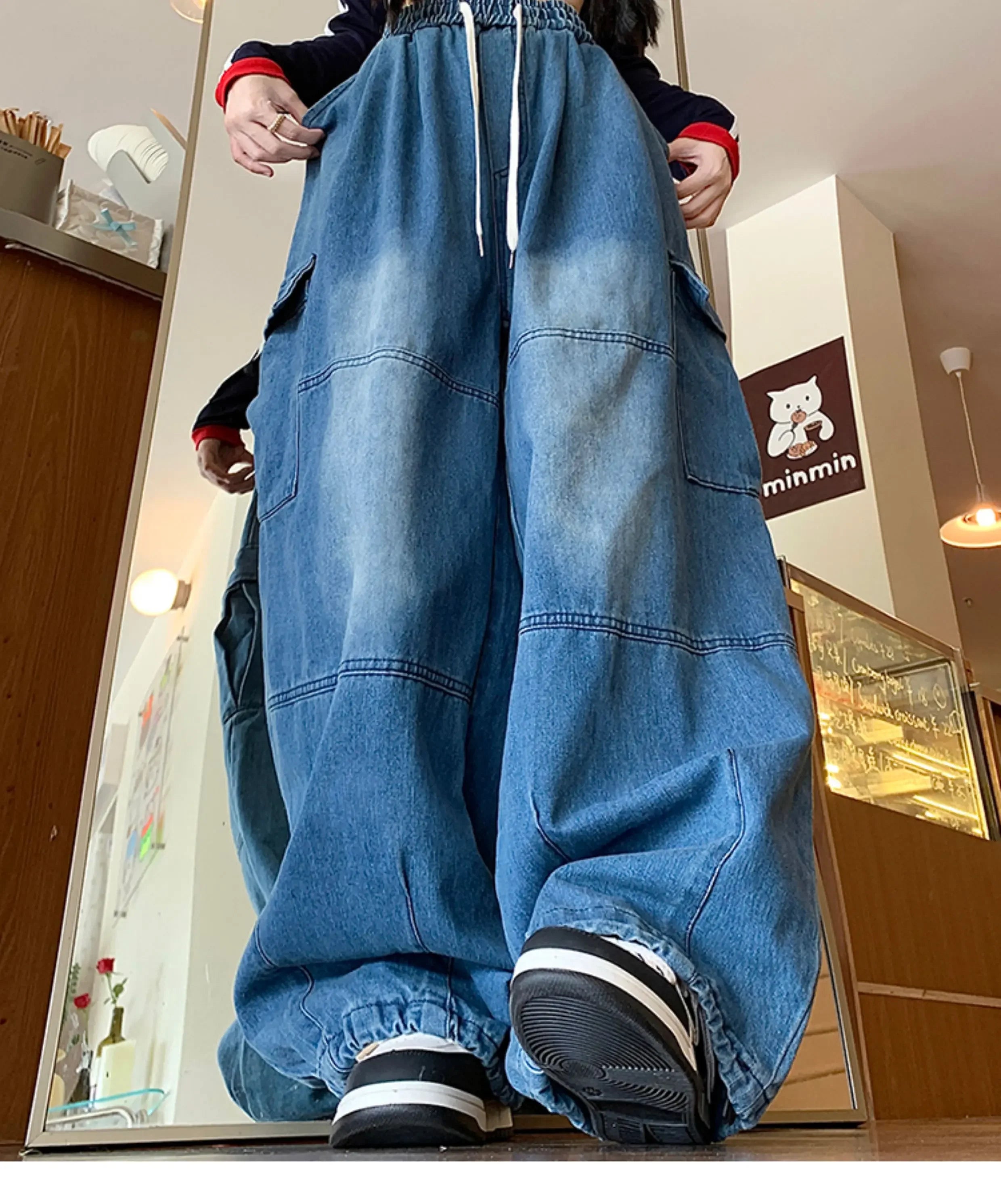 Riolio Cargo Jean Loose Wide Leg Workwear Jeans Elastic Waist Men and Women Spring Autumn Faion Brand Waed Out Trousers Straight Cut