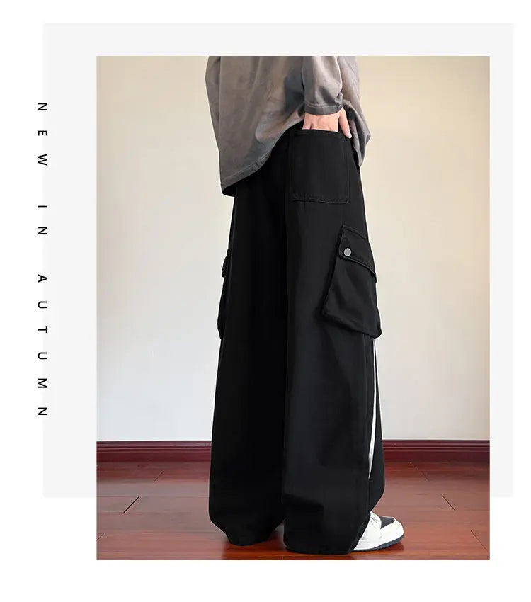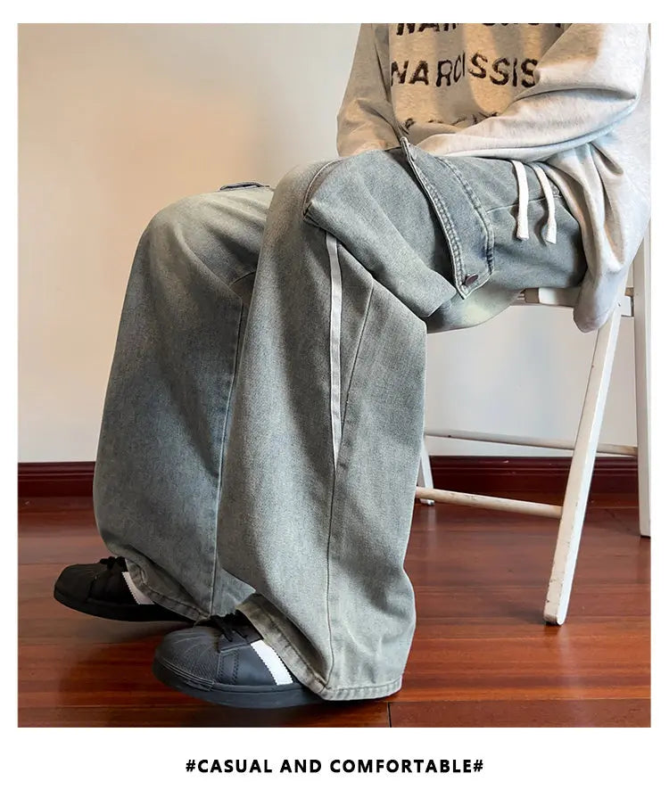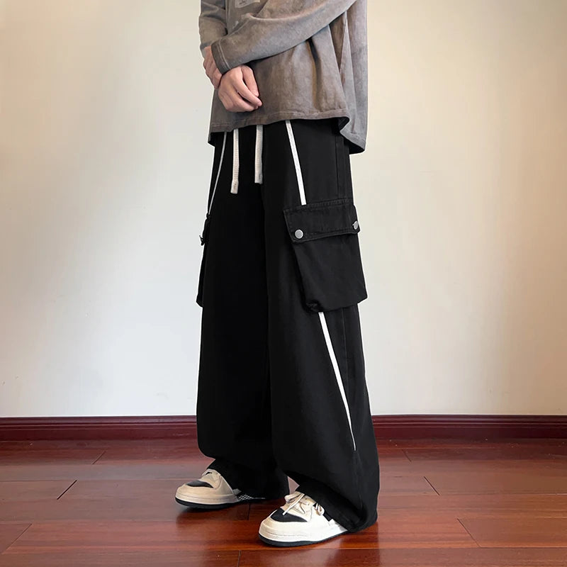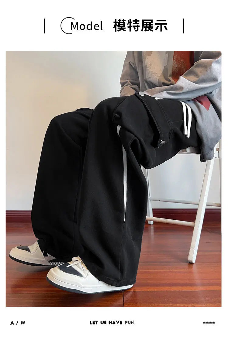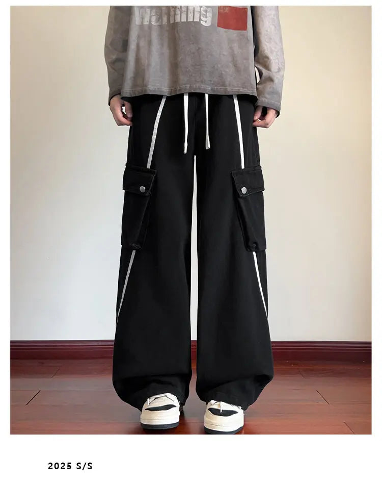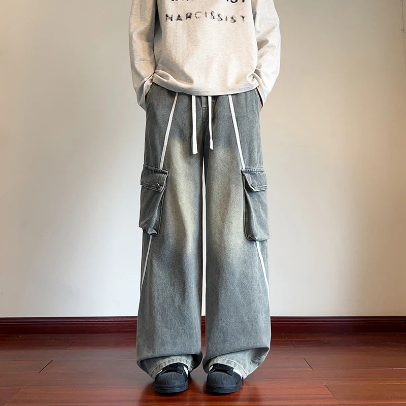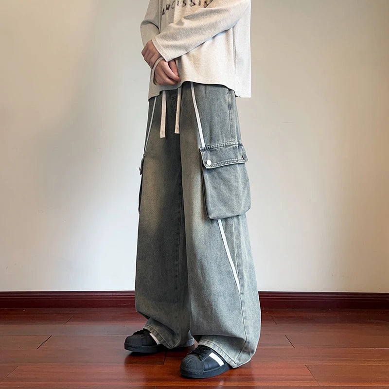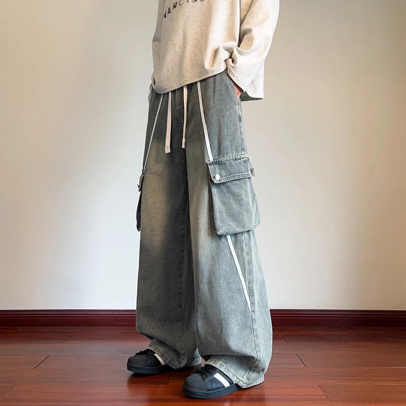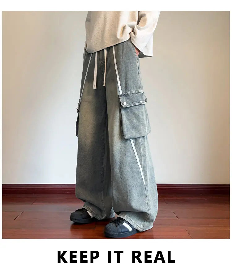 Riolio Cargo Jeans Men Street Dance Loose Trousers Youth Trend Elastic Waist Pants Straps Decoration Big Pockets Workwear Hip Hop