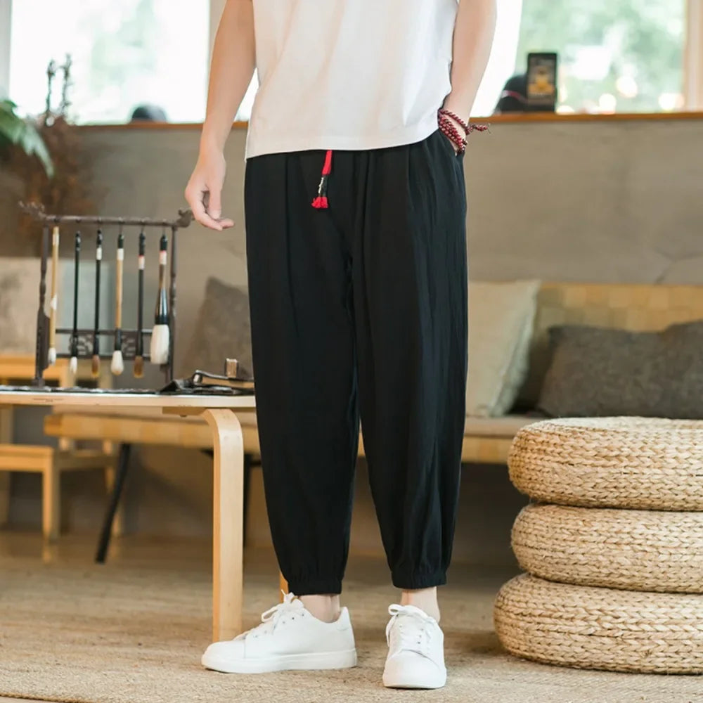 Riolio Men's Cotton and Linen Harem Pants Casual Loose Oversize Beach Pants Chinese Style Wide Leg Trousers Joggers Men Summer