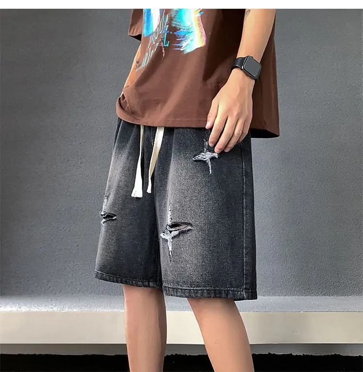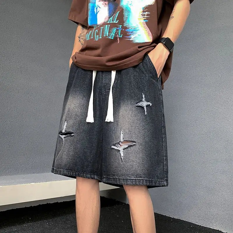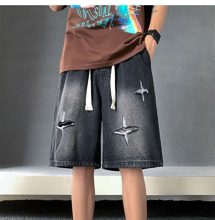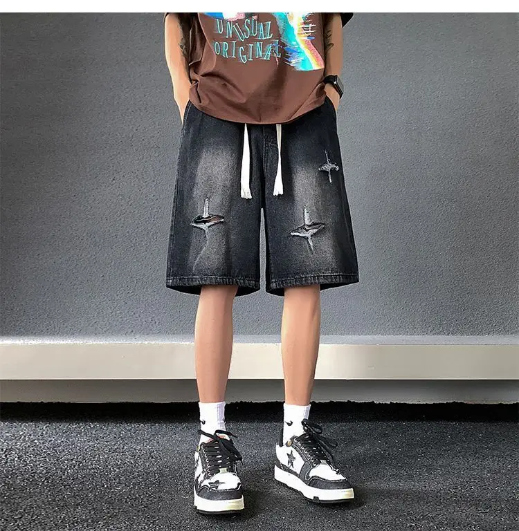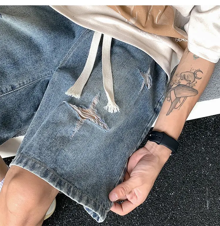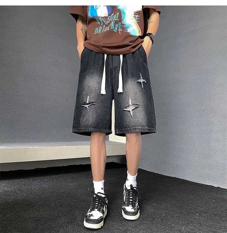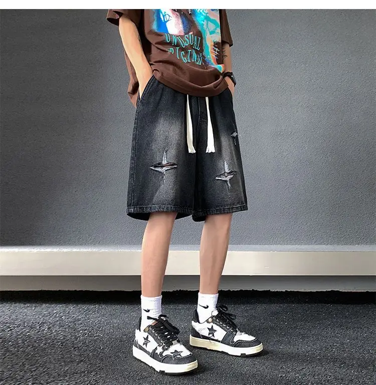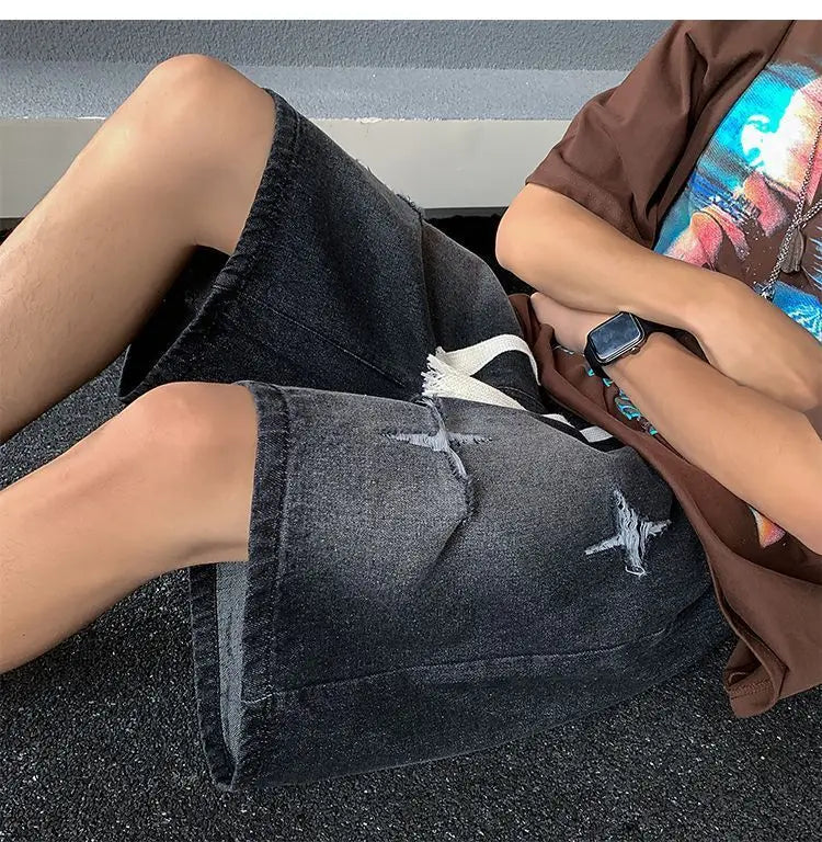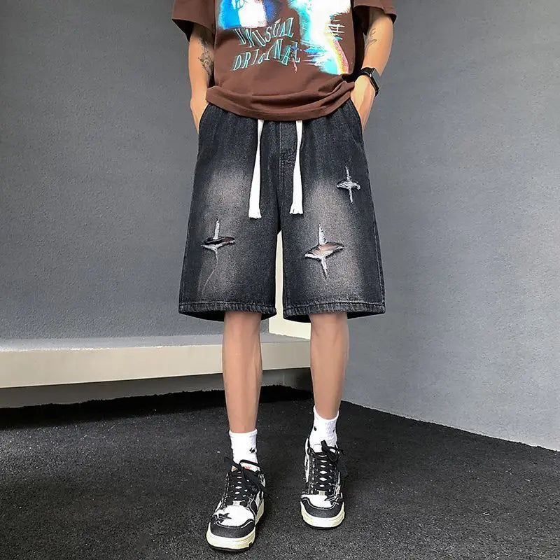 Riolio Men's New Retro Elastic Waist Pocket Fashionable Solid Color Five-point Star Ripped Denim Shorts