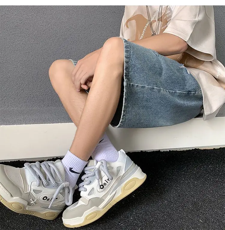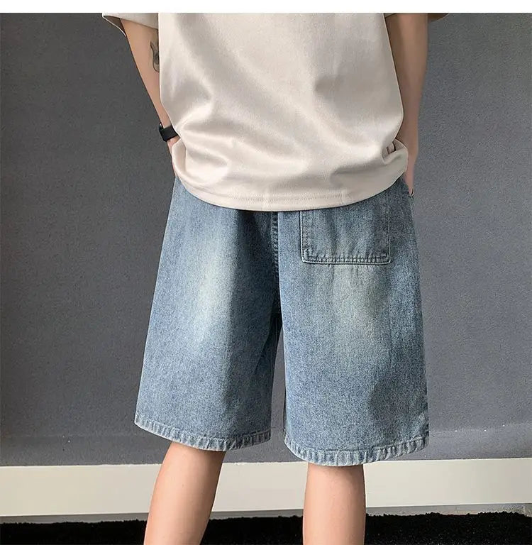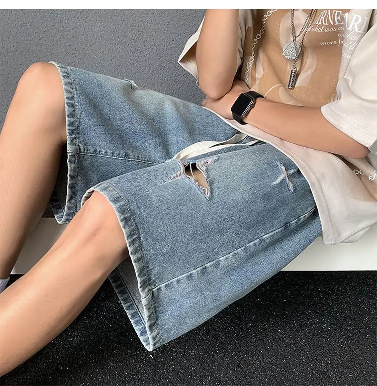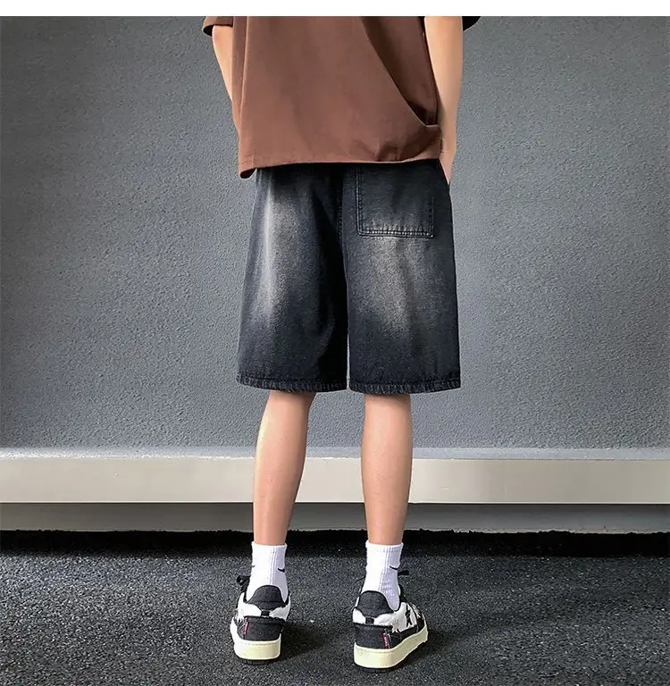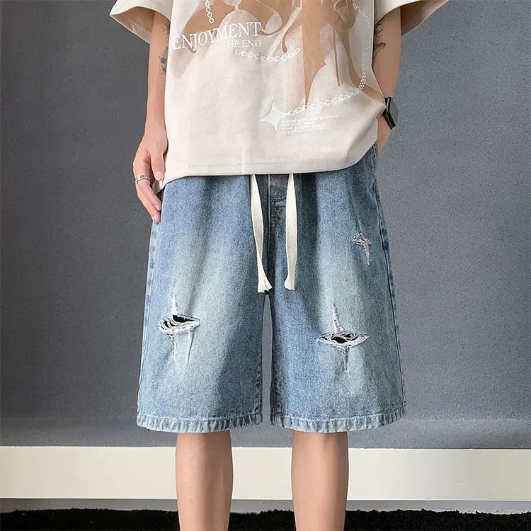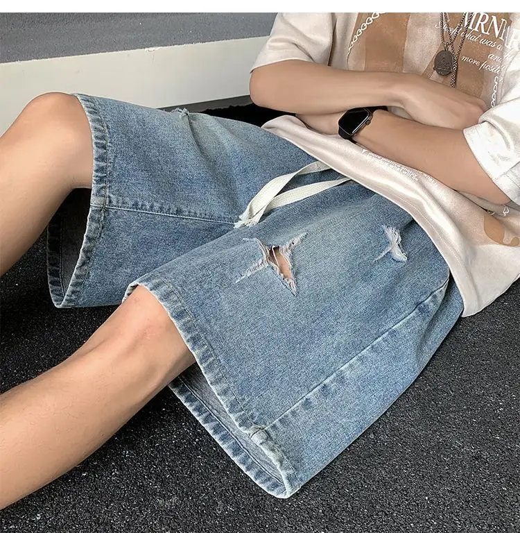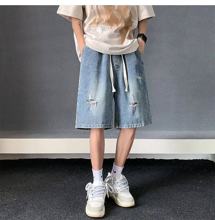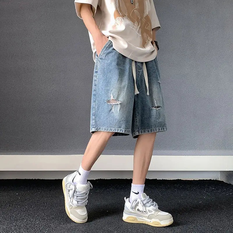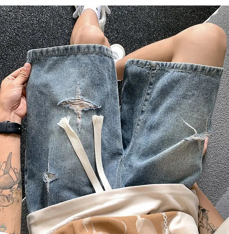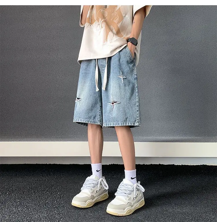Riolio Men's New Retro Elastic Waist Pocket Fashionable Solid Color Five-point Star Ripped Denim Shorts
