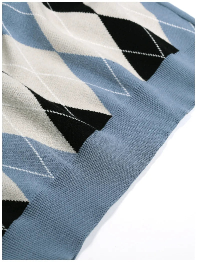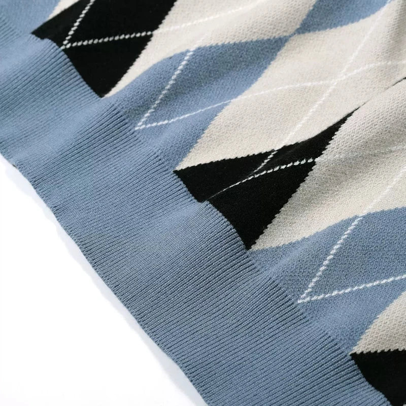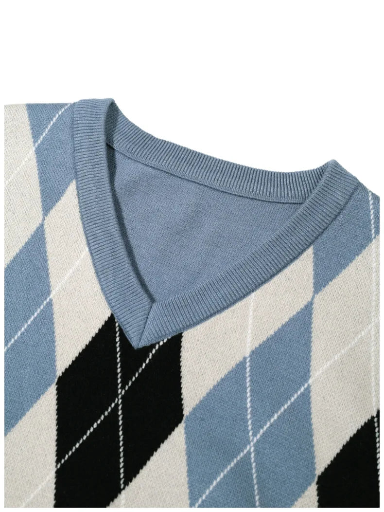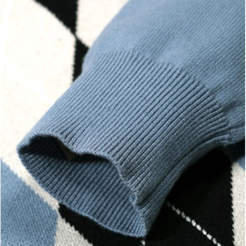 Riolio New Japanese Retro Men Sweater Luxury Trendy Plaid Patchwork V Neck Knit Solid Color Pullover Leisure Loose Long Sleeve Knitwear