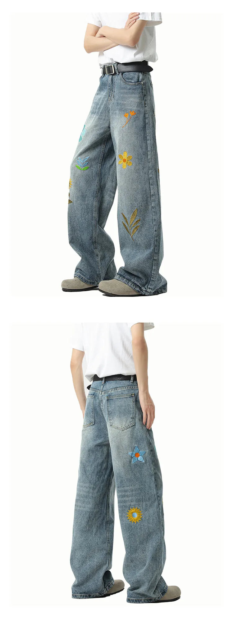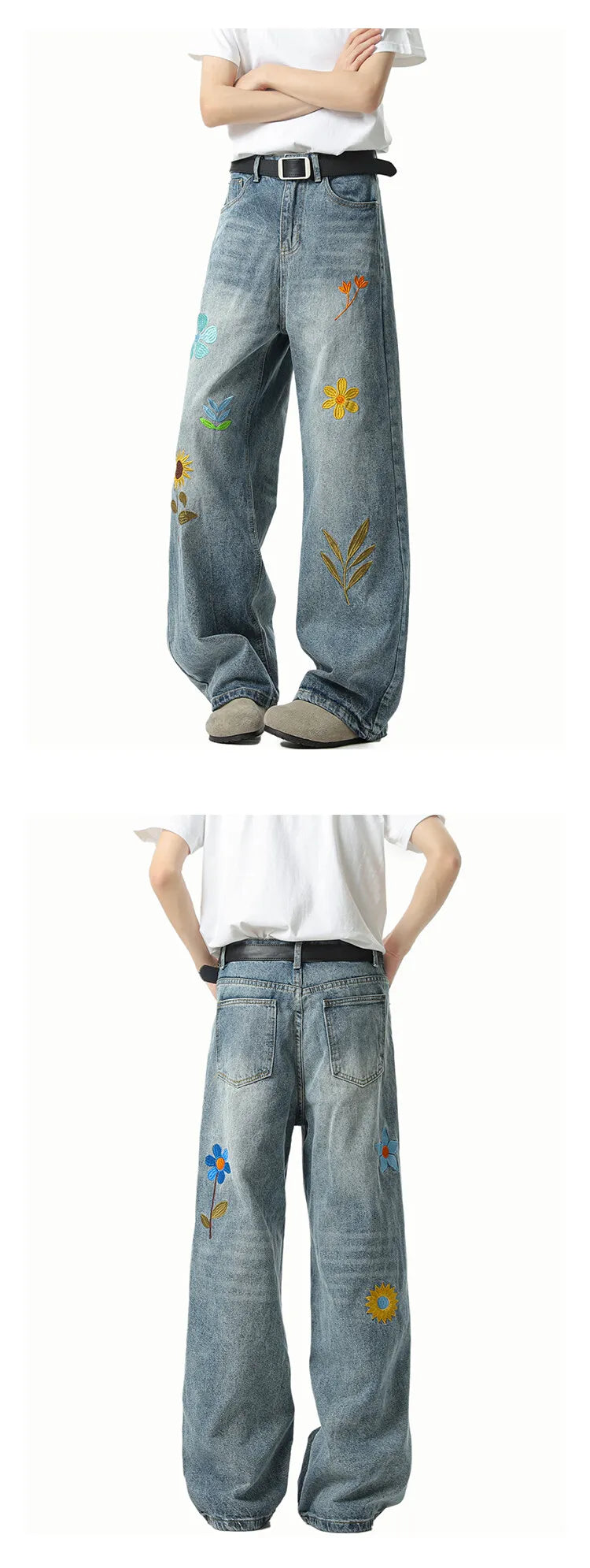 Riolio  Washed Embroidered Jeans Loose Fit Straight Wide Leg Casual Denim Pants Fashion Trendy Streetwear Trousers Comfort