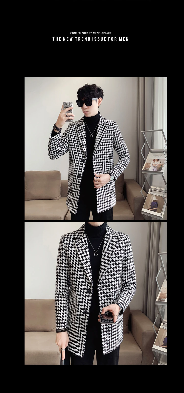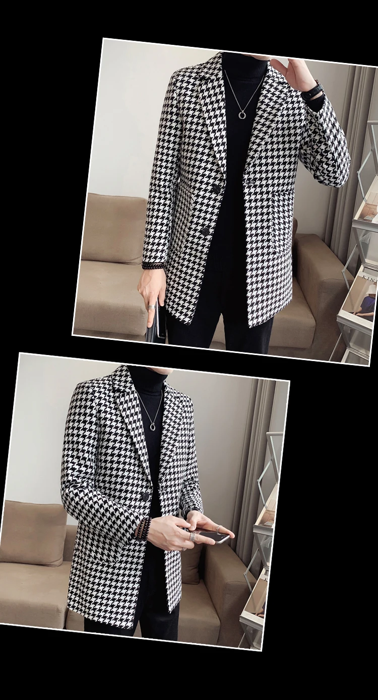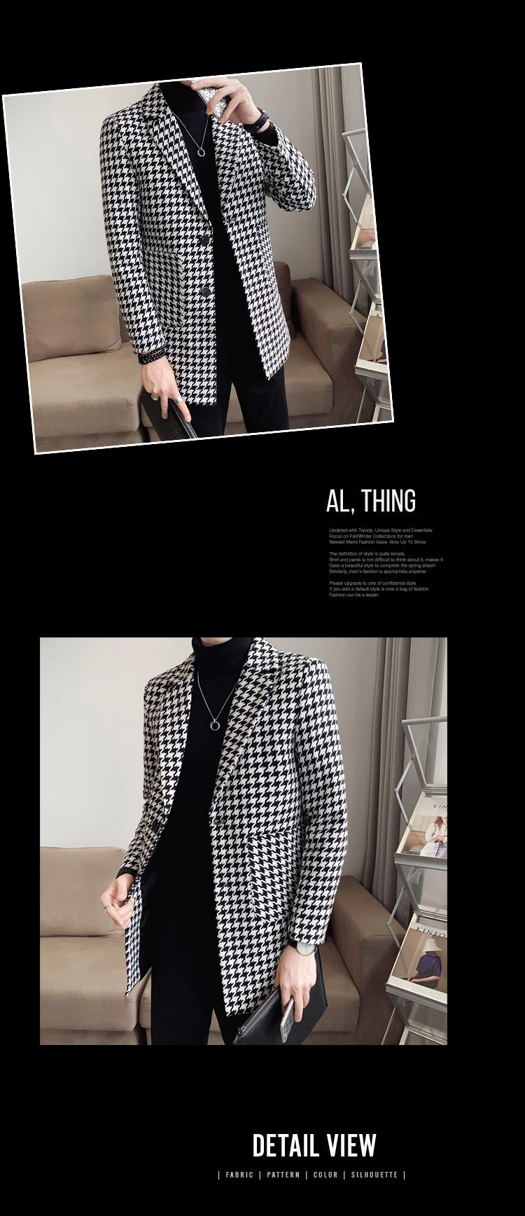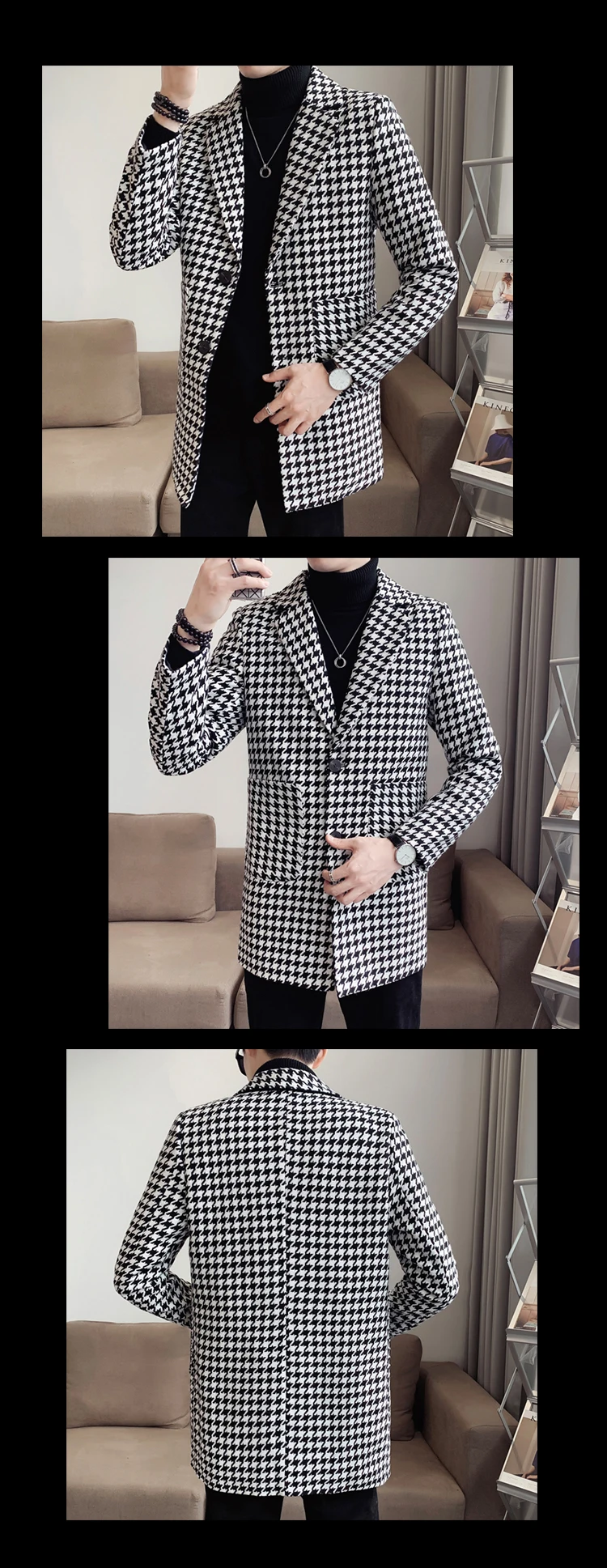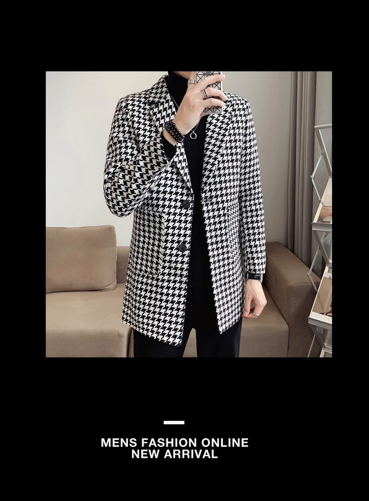 Houndstooth Lapel Mid-Length Men Windbreaker Coat Winter Suit Collar Fashion Print Casual Overcoat Jacket Streetwear Social Coat