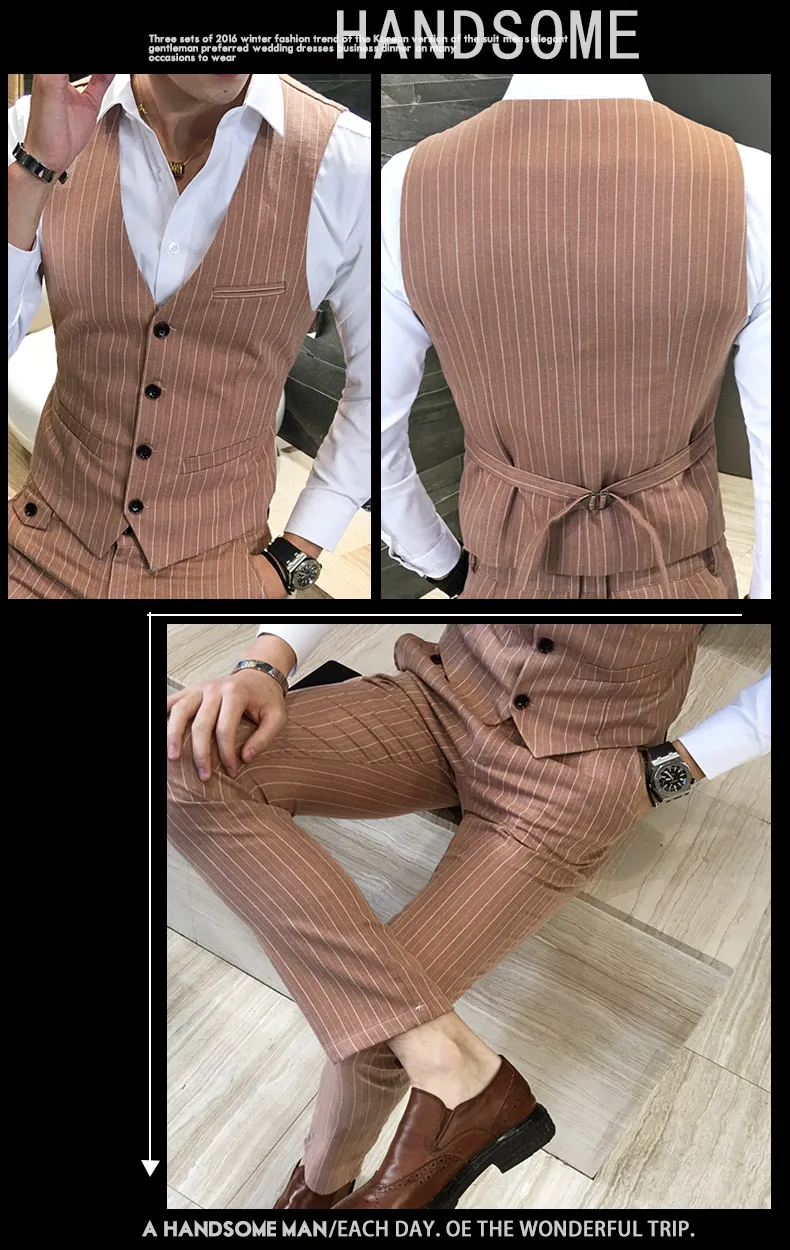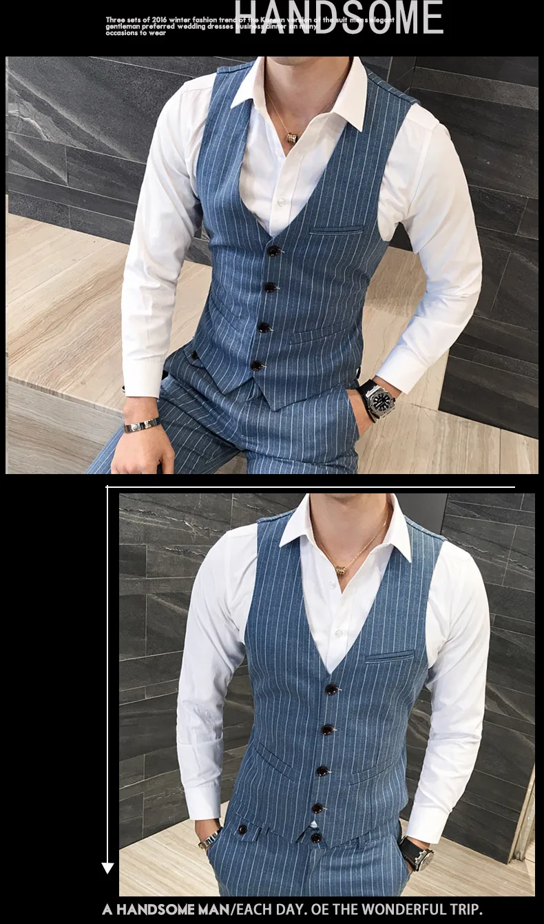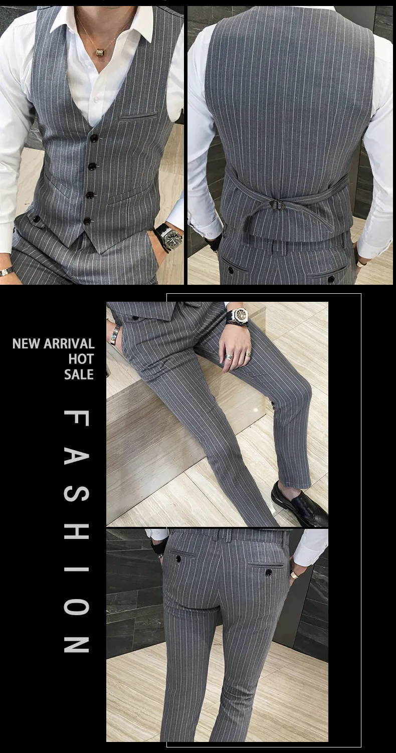 ( Jackets + Vest + Pants ) Men's Fashion High-grade Business Striped Suit Three-piece Men Wedding Dress Smart Suit Blazers