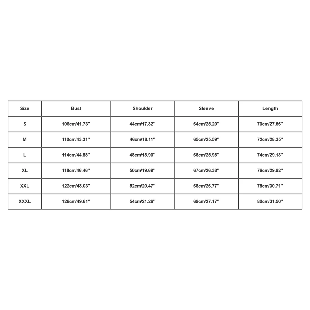 | Size:XXL | Bust:122cm/48.03'' | Shoulder:52cm/20.47'' | Sleeve:68cm/26.77'' | Length:78cm/30.71'' |