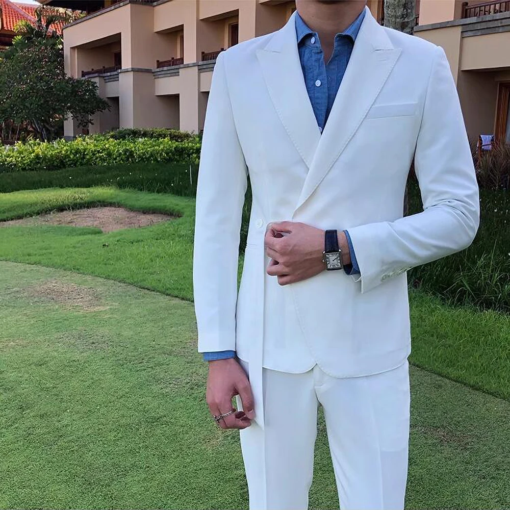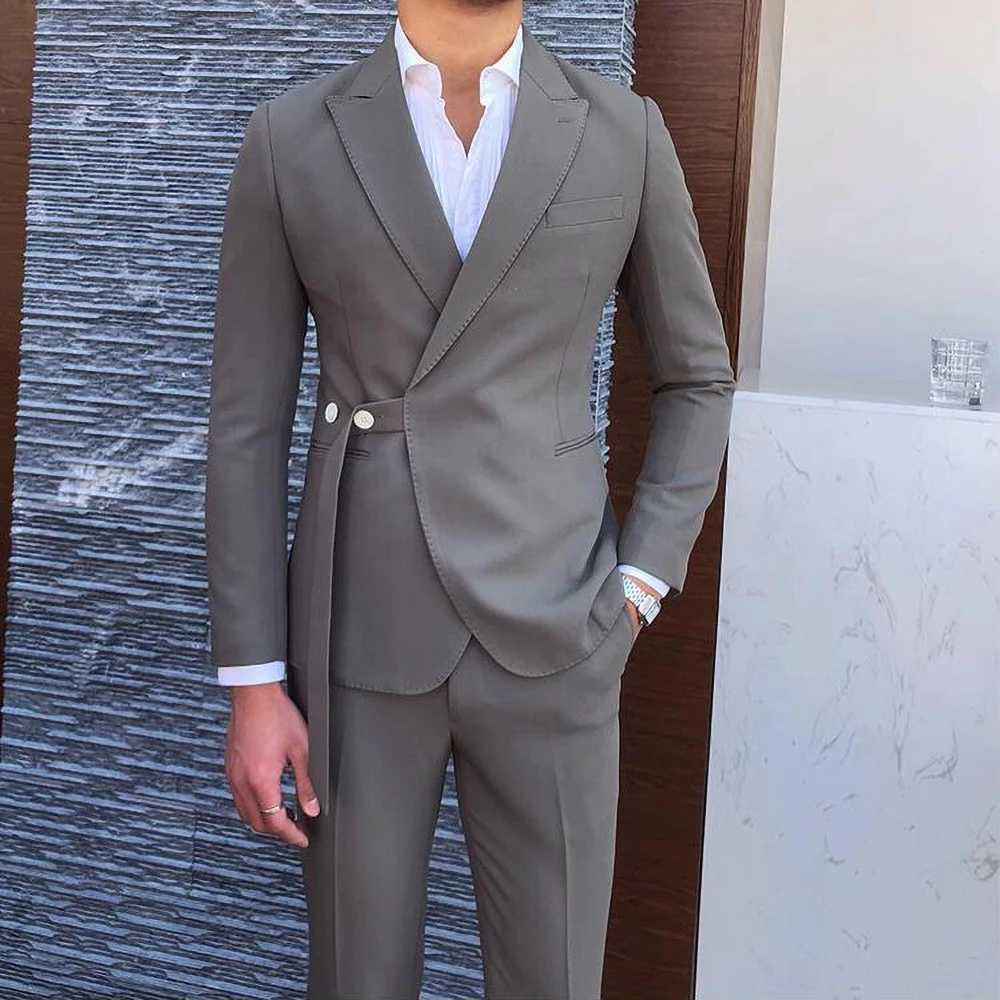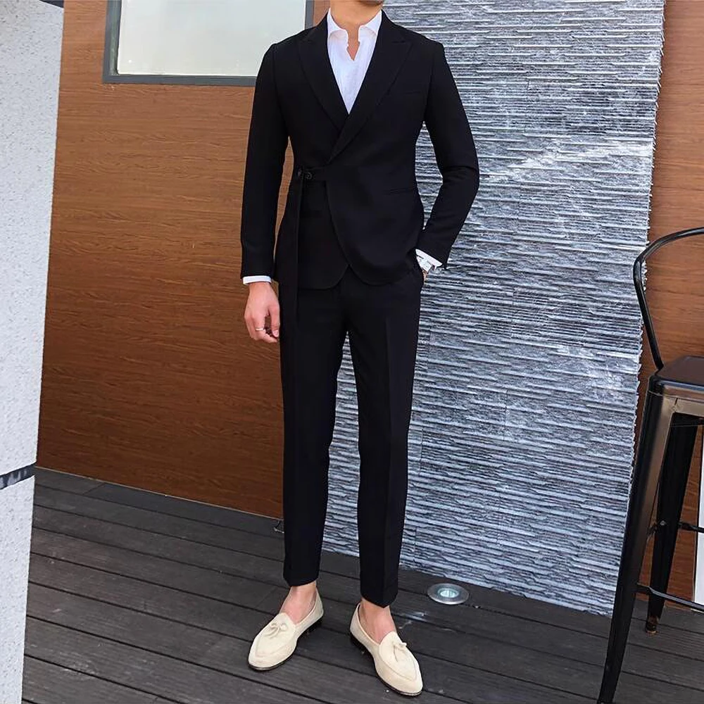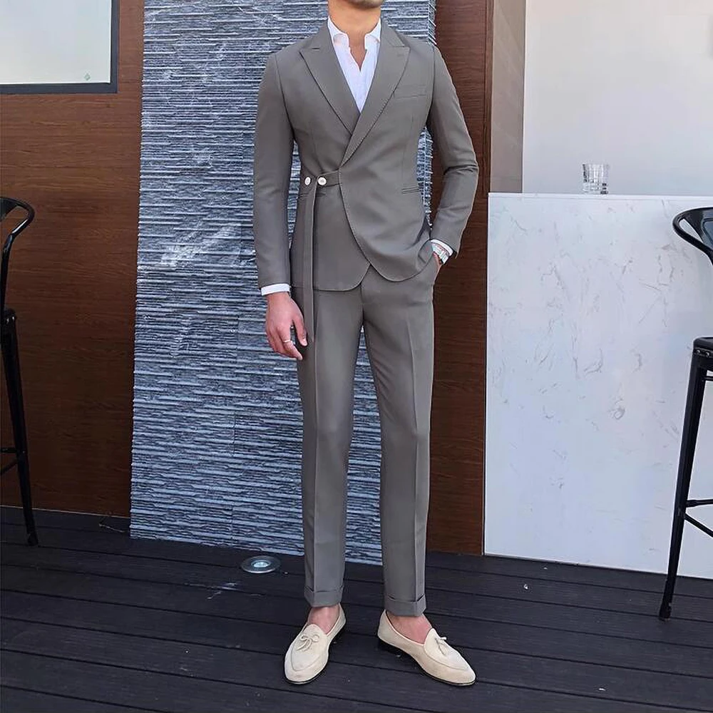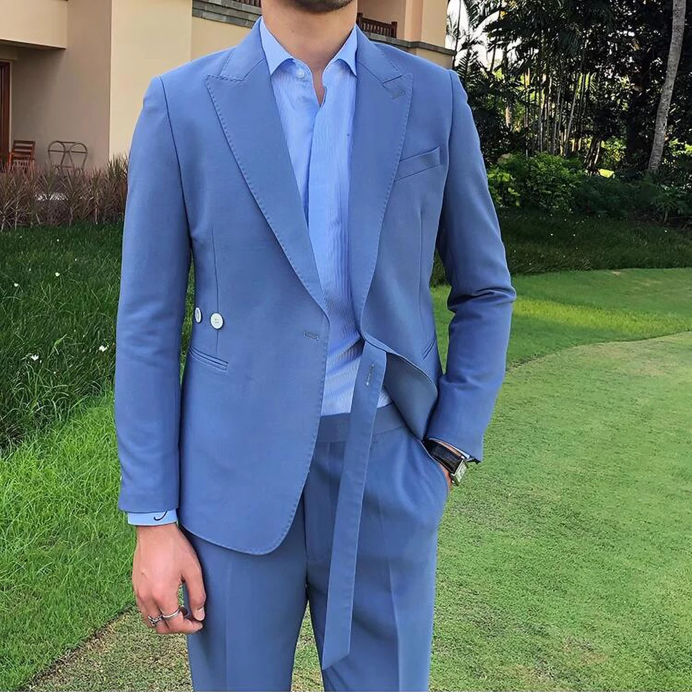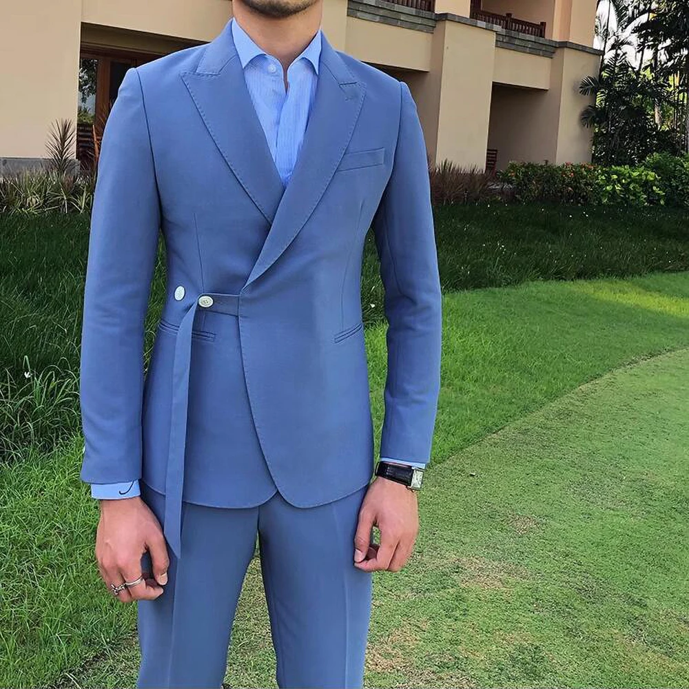 Riolio New Fashion Men Suits Blue Peak Lapel and Belt Linen Men's Clothing Smart Casual Groom Wedding Slim Fit 2 Piece Blazer Pants