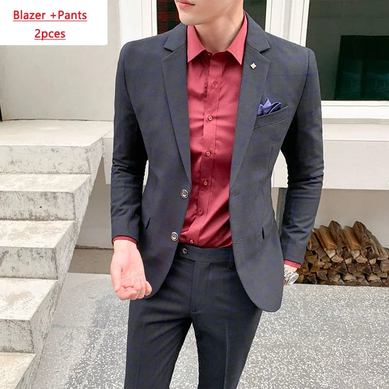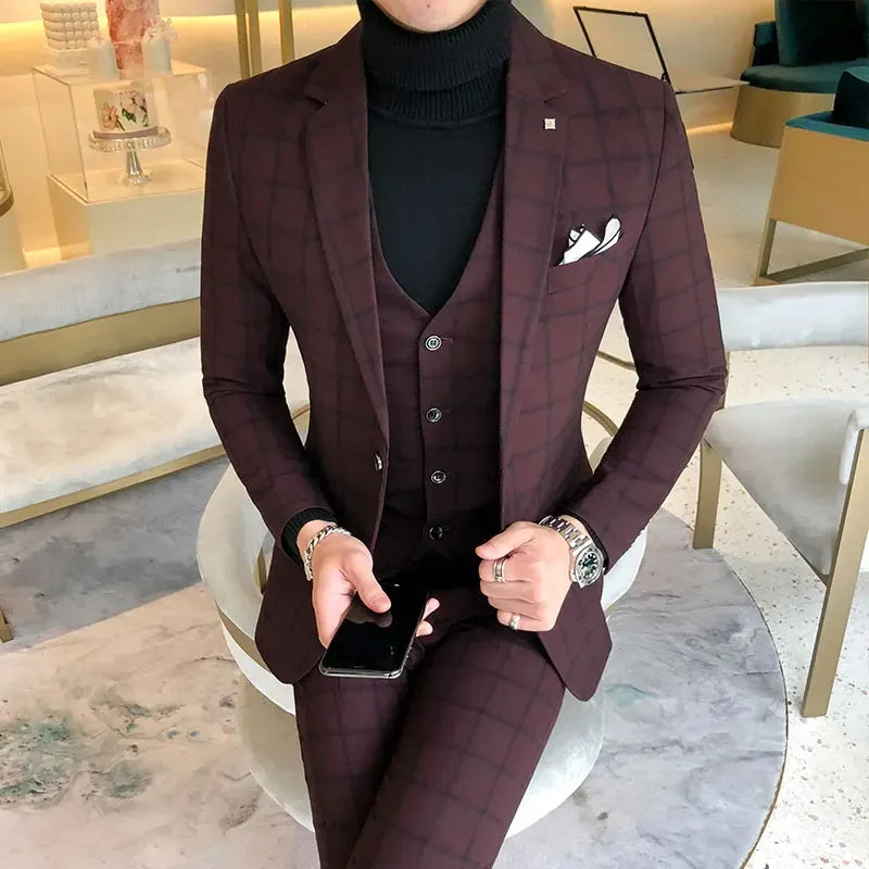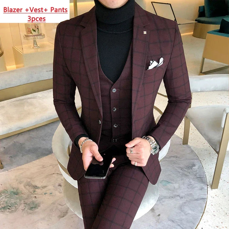 Riolio Blazer and Vest and Pants / Boutique Fashion Plaid Men's Casual Business Suit 3pcs Set Groom Wedding Dress Performance Costume