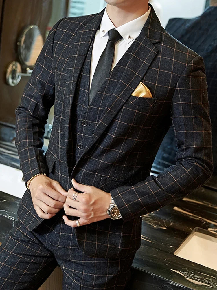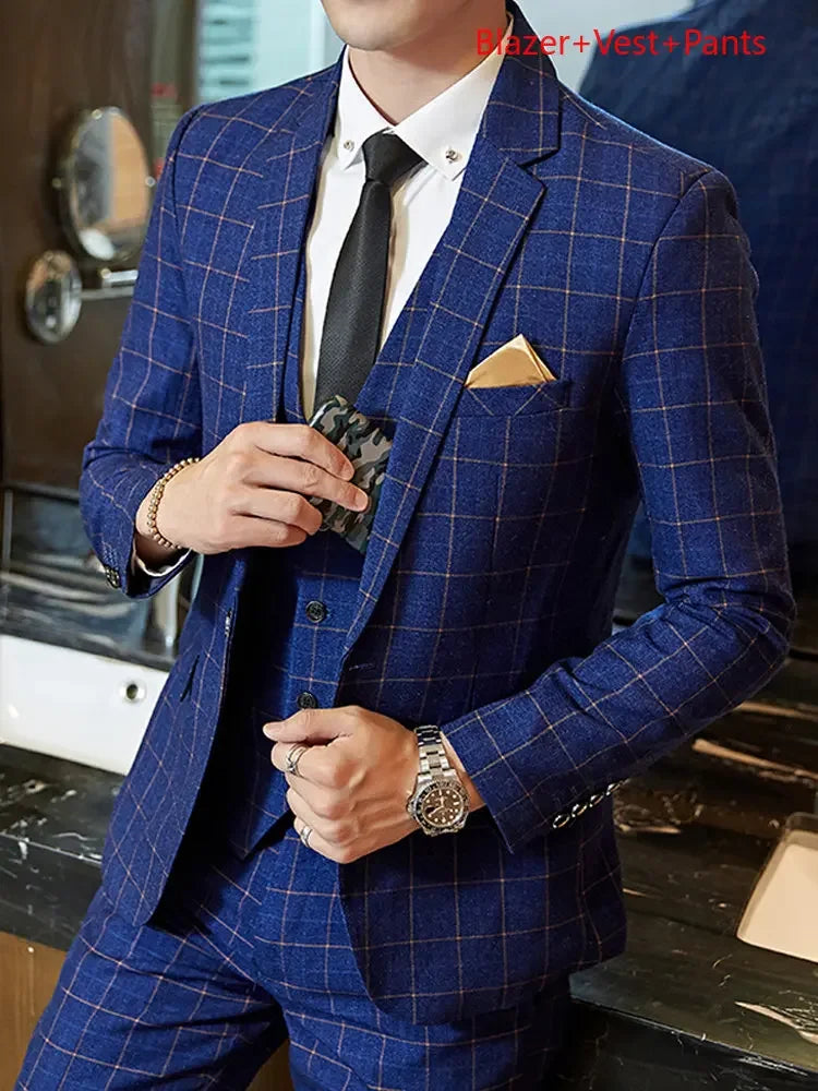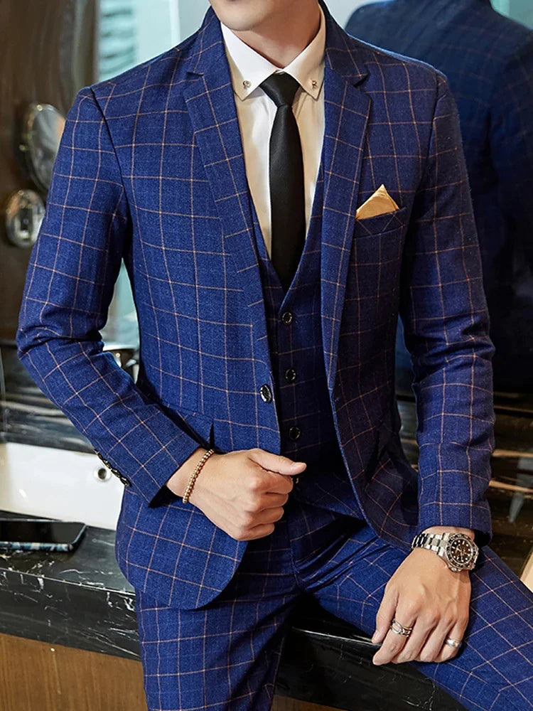 Riolio  Blazer Vest Pants Groom Wedding Dress Stage Party Suit Three Piece Set and Two Piece Set Mens casual business classic plaid suit