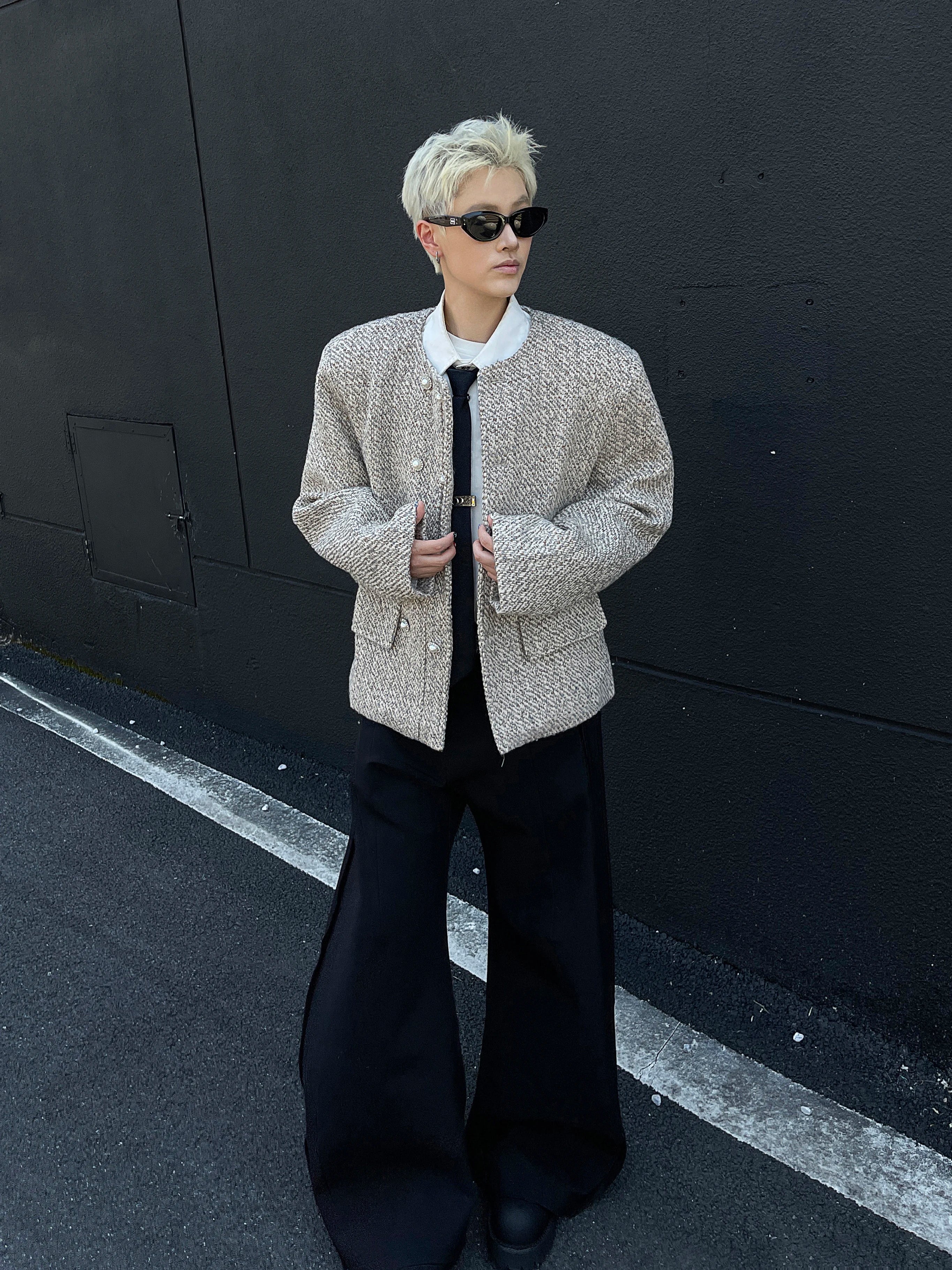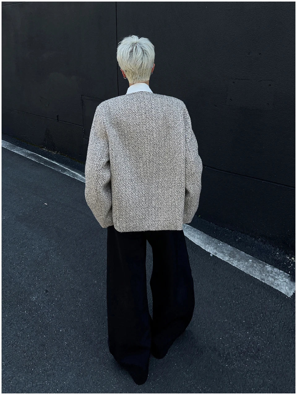 Riolio Male Elegant O-neck Blazer Coat High-end Shoulder Pad Collarless Jacket American Autumn Button Short Suit Jacket Handsome Top