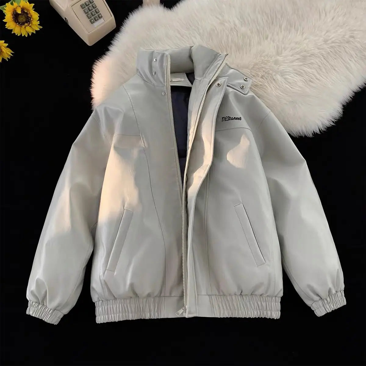 Riolio Winter men and women trendy and personalized PU leather jacket for couples loose and thick motorcycle suit stand up collar top
