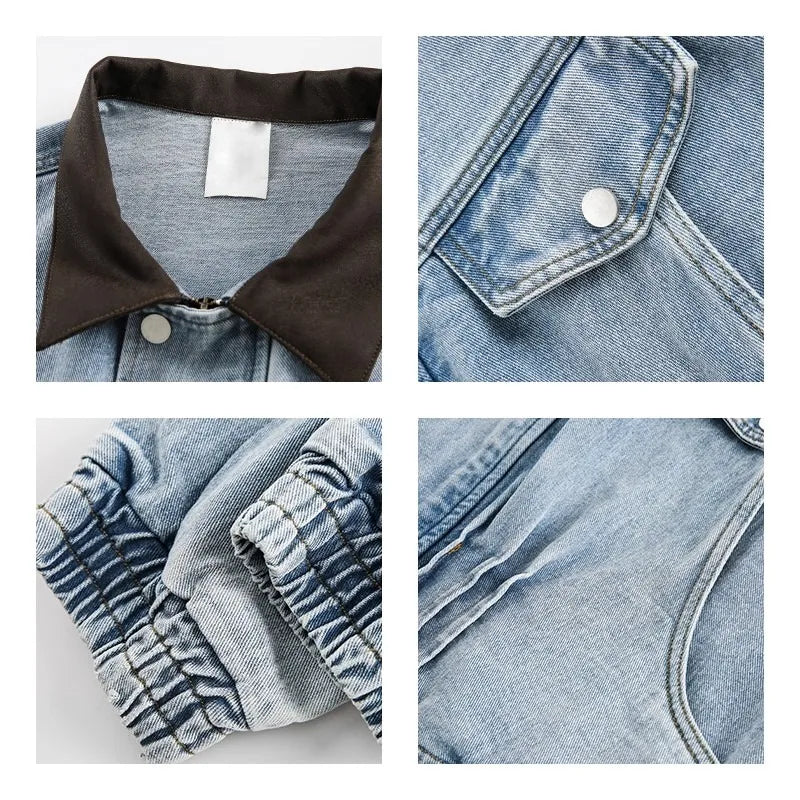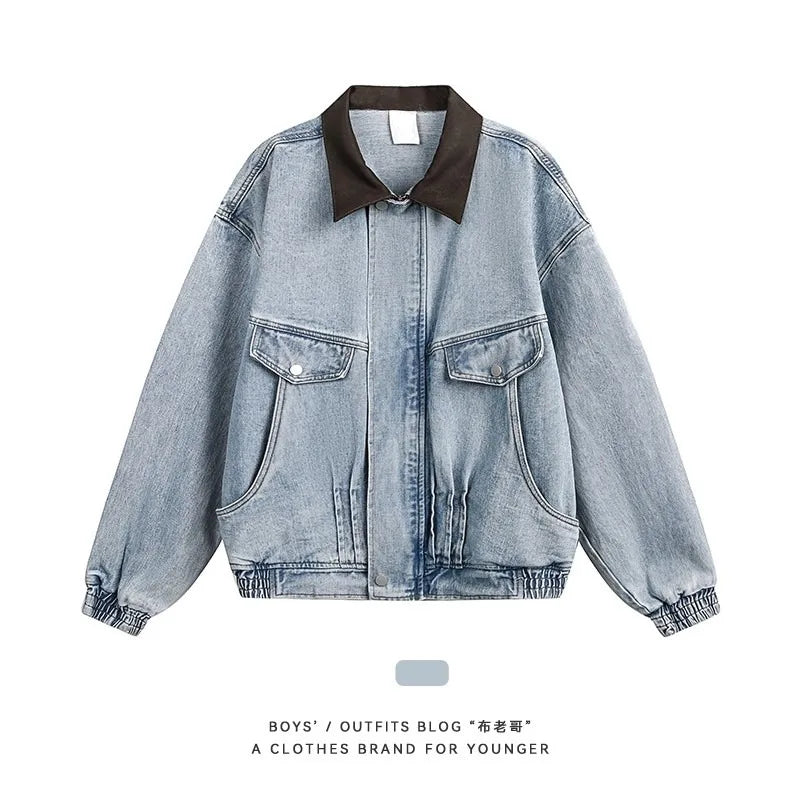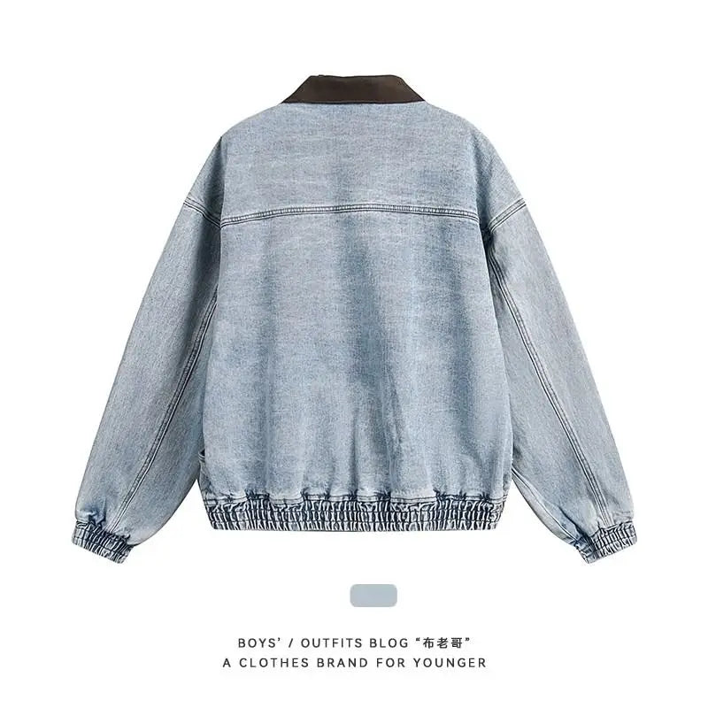 Riolio New Autumn Winter Men Denim Jacket Color Block Collar Fashion Large Pockets Outdoor Casual Coat Streetwear Trending Outerwear