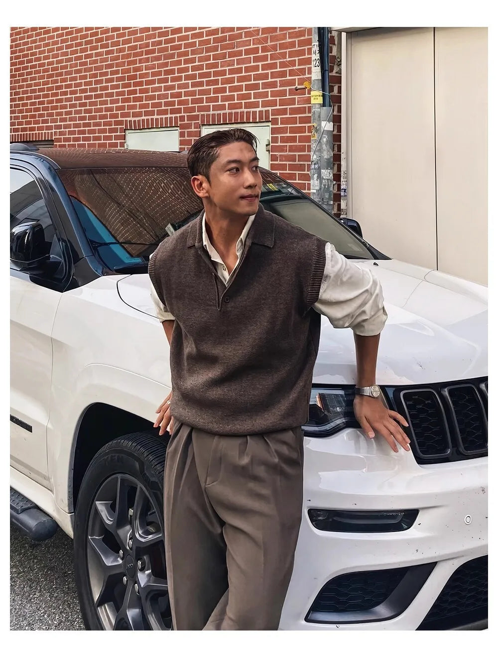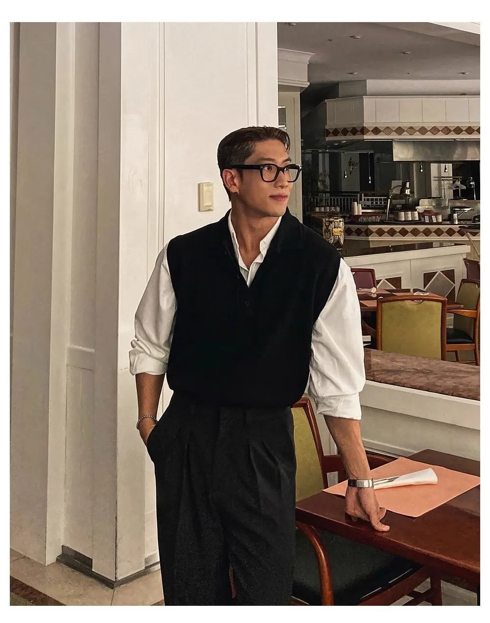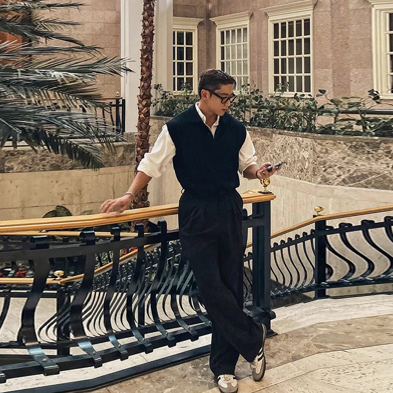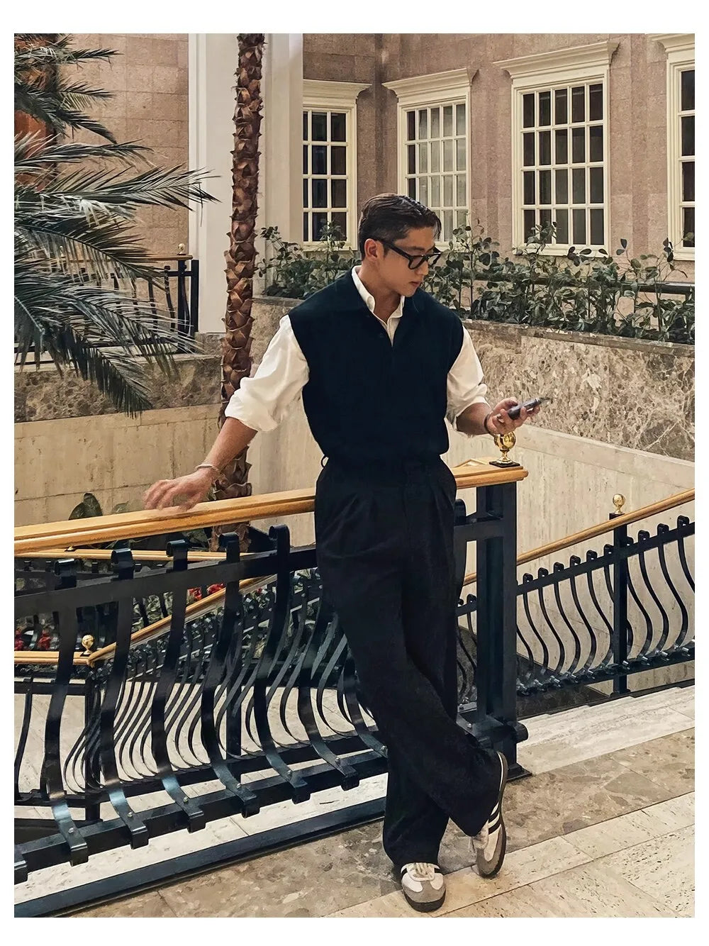 Riolio New Korean Fashion Polo Neck Men Sweater Vest Light Luxury Retro Business Knitted Sleeveless Waistcoats Leisure Premium Knitwear
