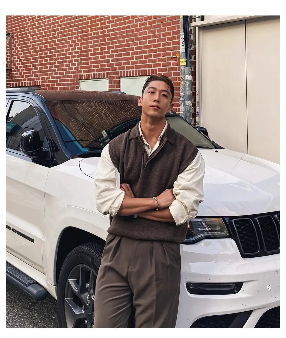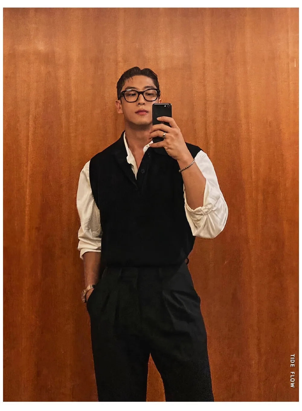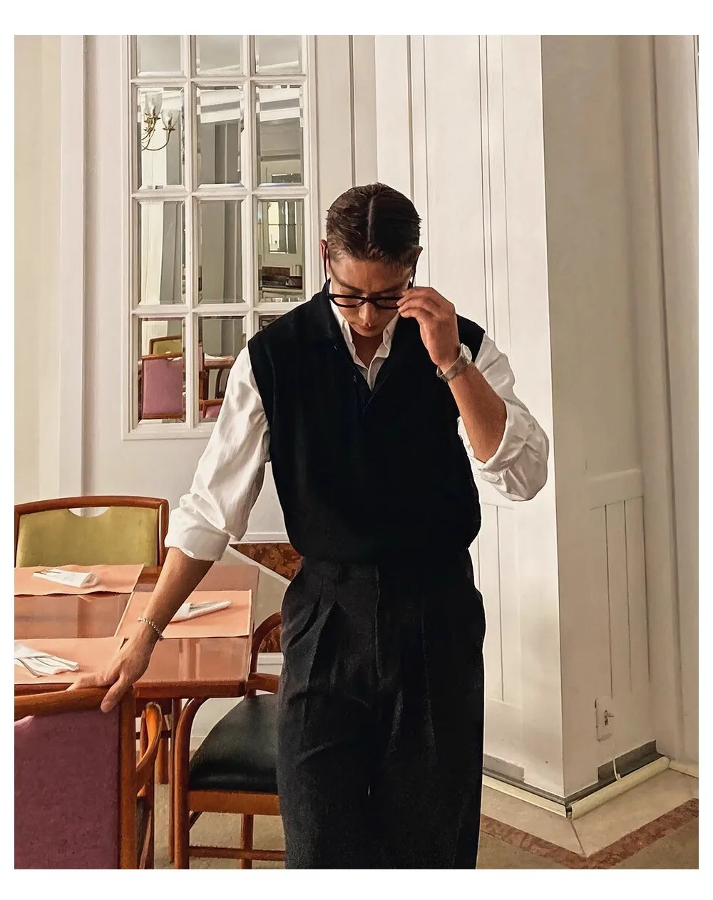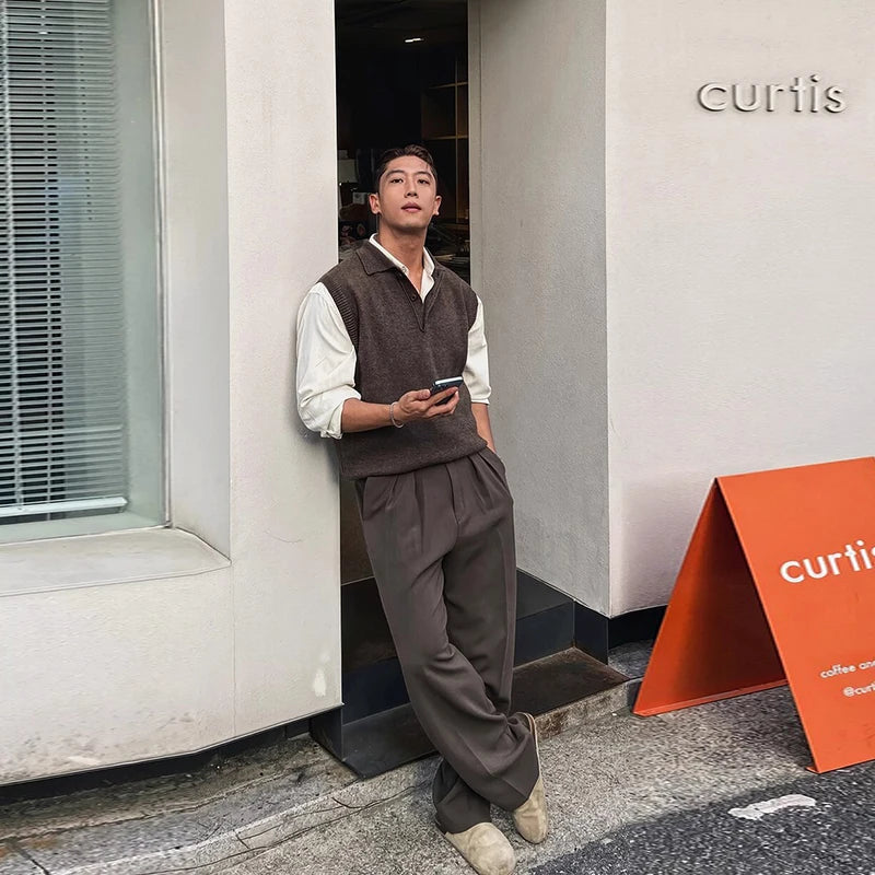 Riolio New Korean Fashion Polo Neck Men Sweater Vest Light Luxury Retro Business Knitted Sleeveless Waistcoats Leisure Premium Knitwear