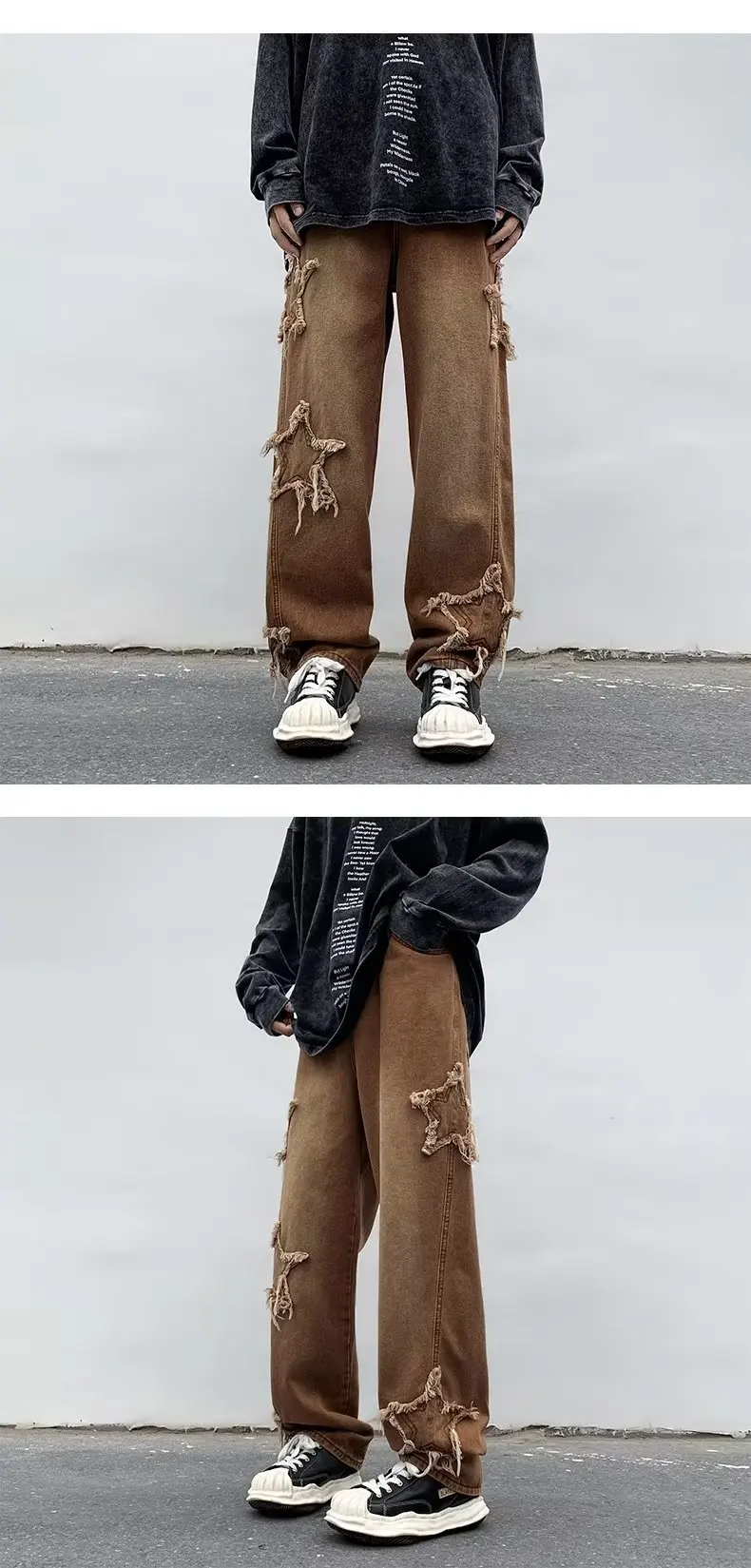 Riolio New Fashion Stars Towel Embroidery Brown Baggy Men Jeans Pants Y2K Clothes Straight Hip Hop Cotton Trousers Pantalon Homme