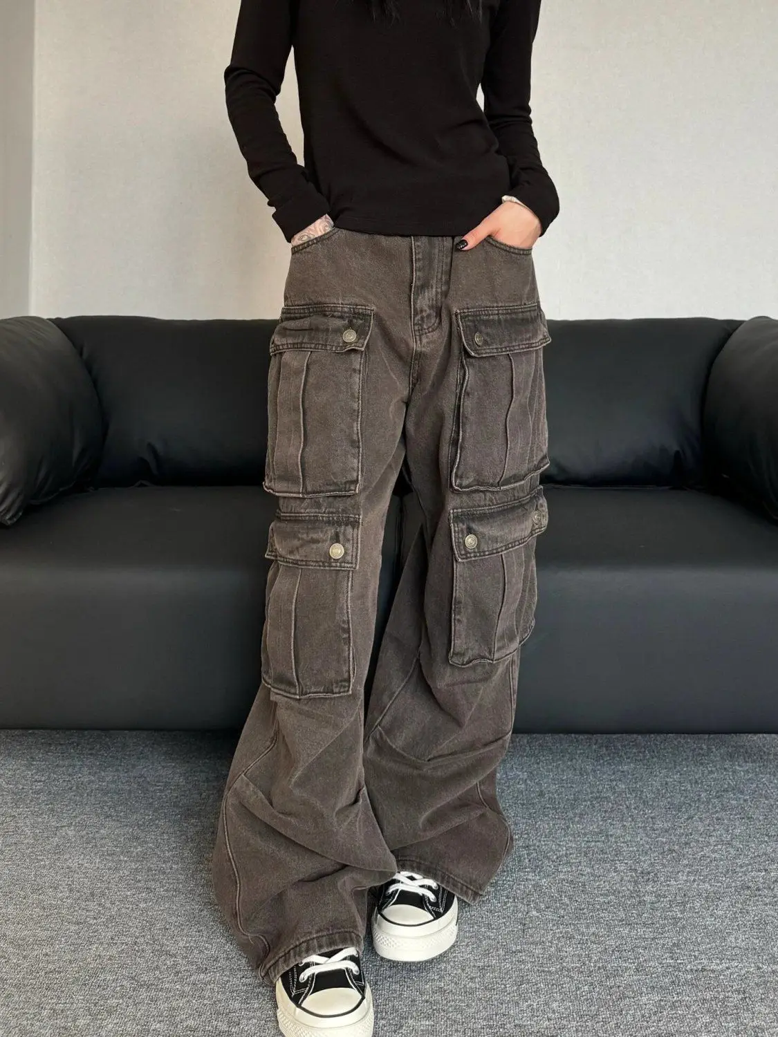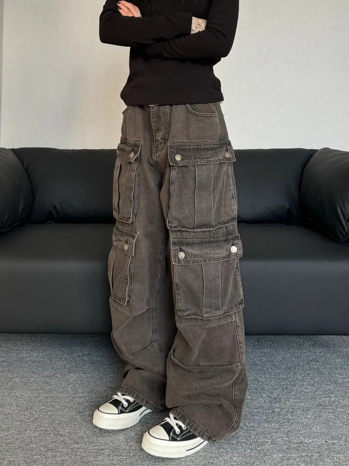 Riolio  American retro washed multi pocket workwear straight leg jeans for men and women street cool loose wide leg casual pants y2k