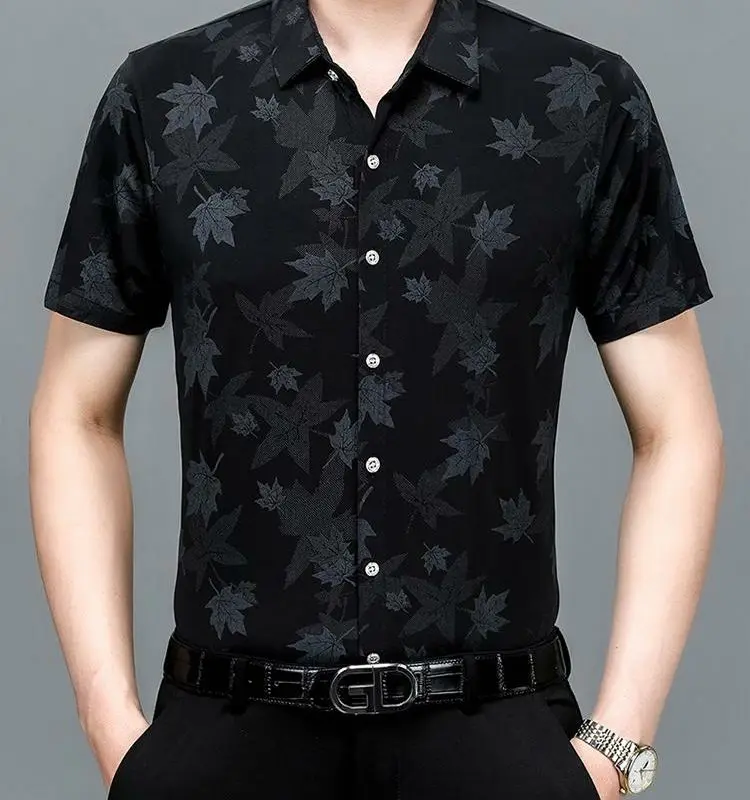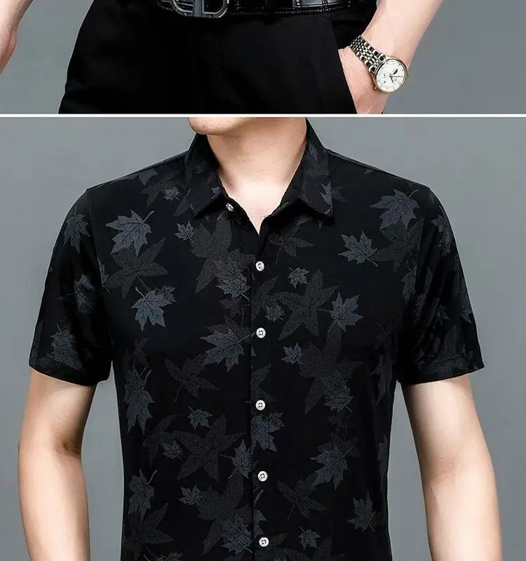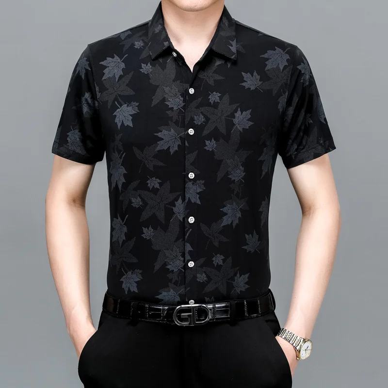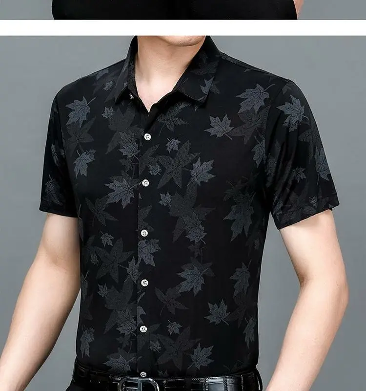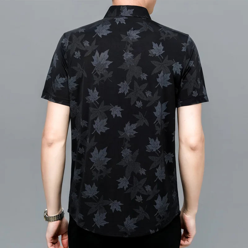Riolio Men's Summer Ice Silk Short Sleeved Shirt Maple Leaf Print Business Casual Trend