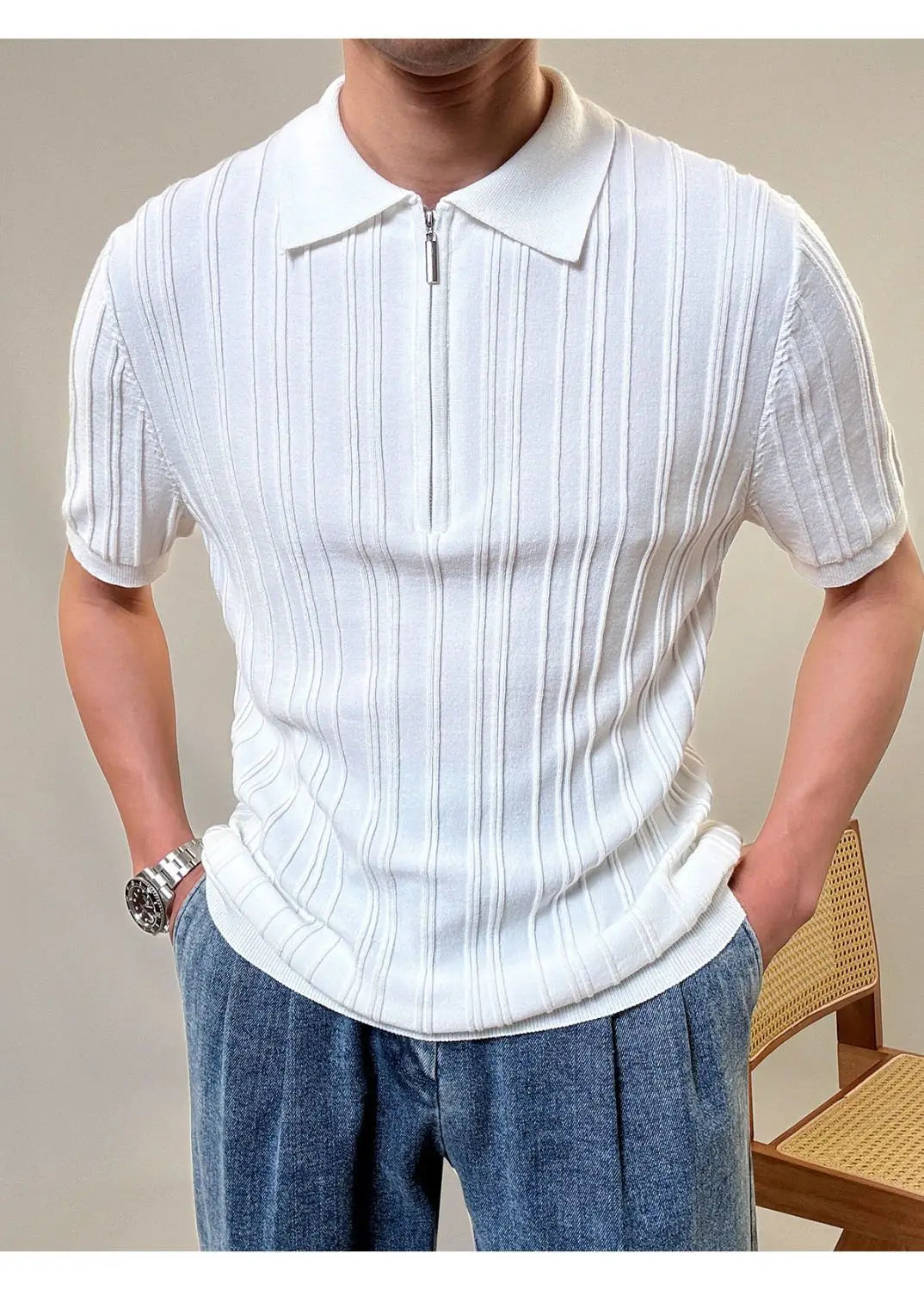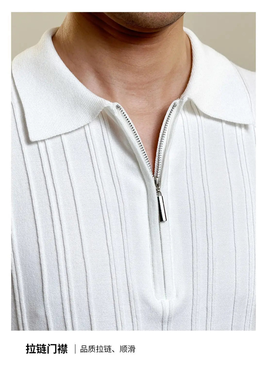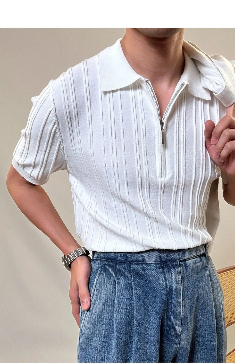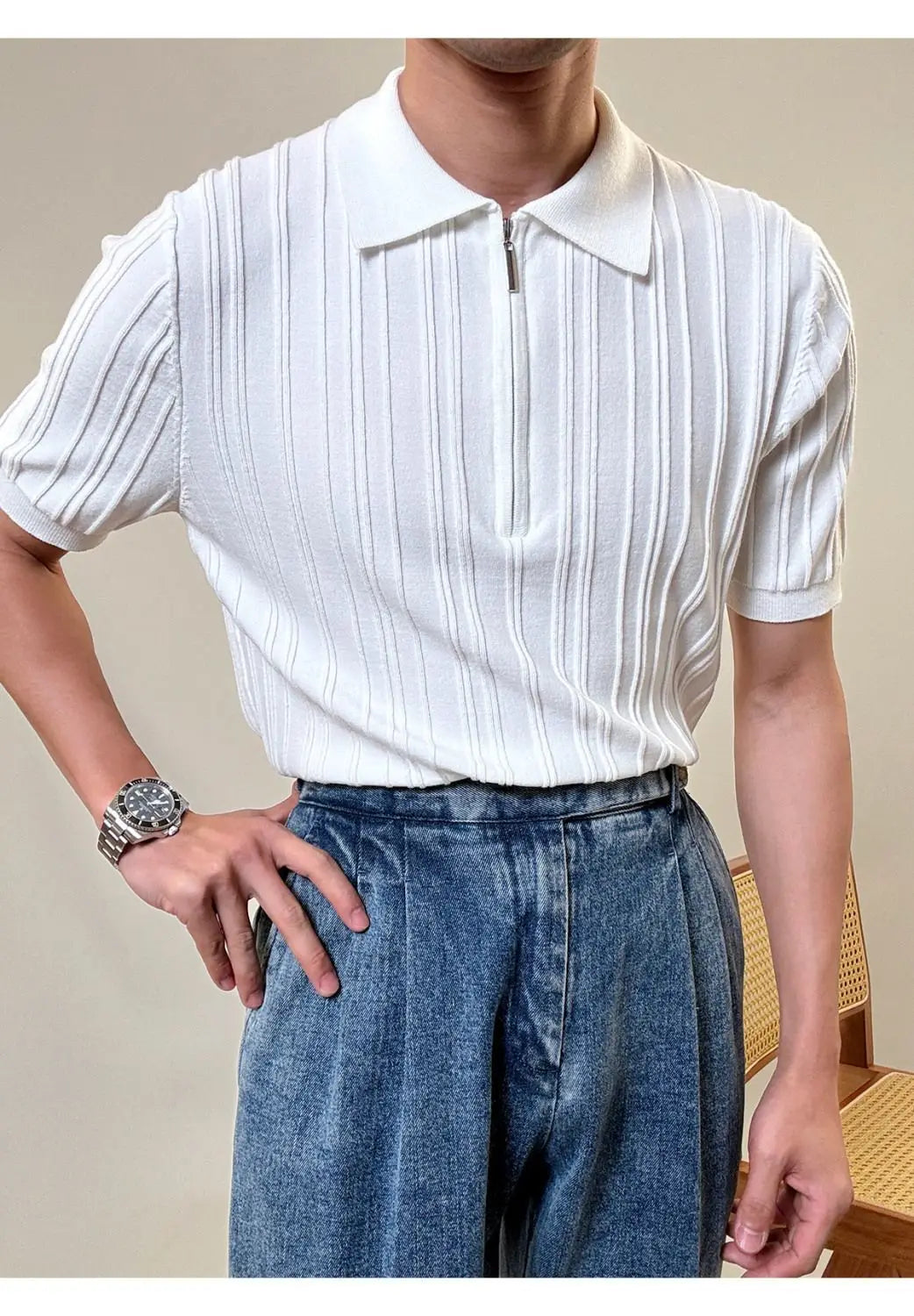 Riolio Zipper Knitted Short-sleeved Polo Shirt Men Summer American Retro Commuting Loose Vertical Striped Pit Strip Lapel T-shirt Men