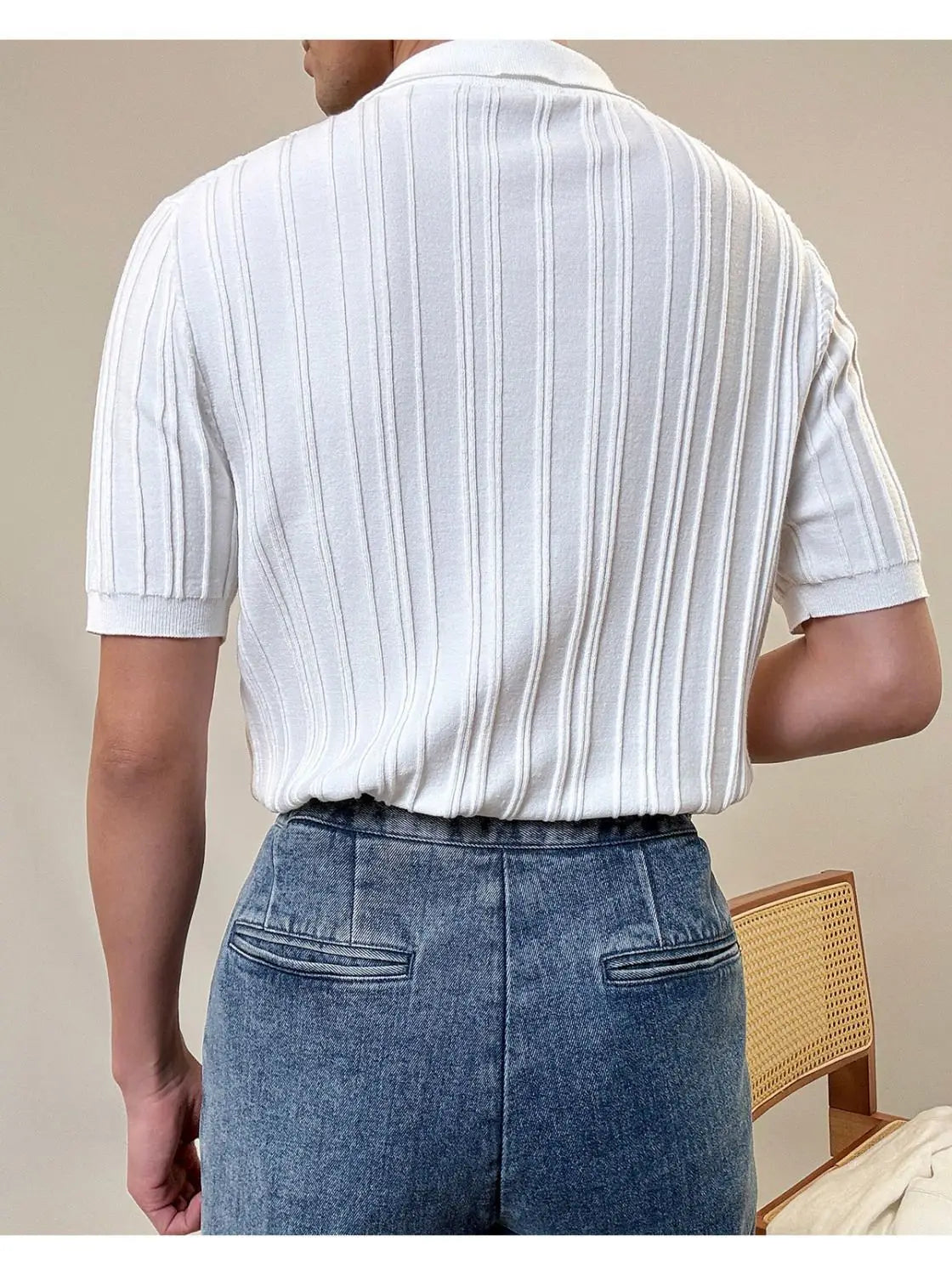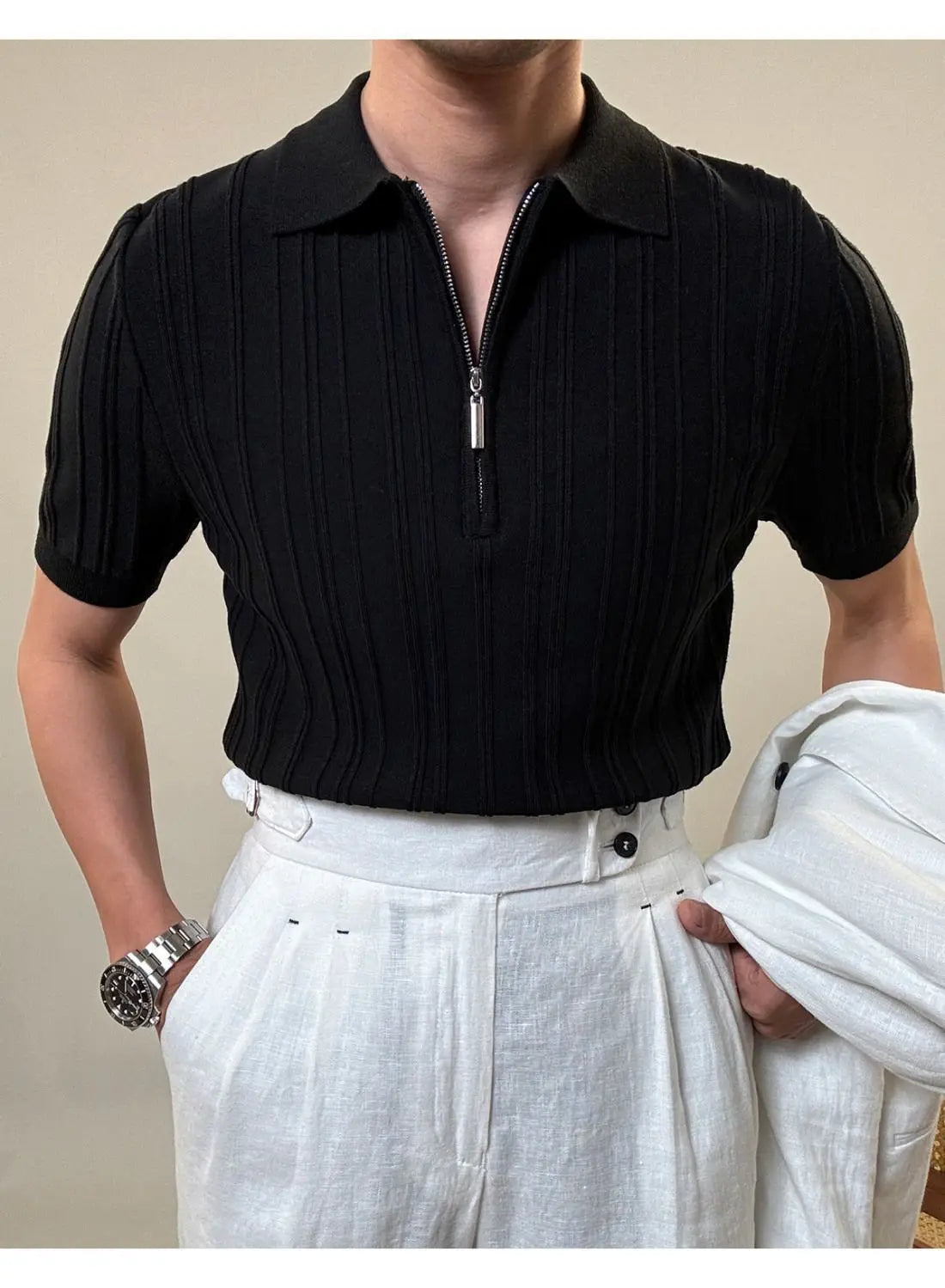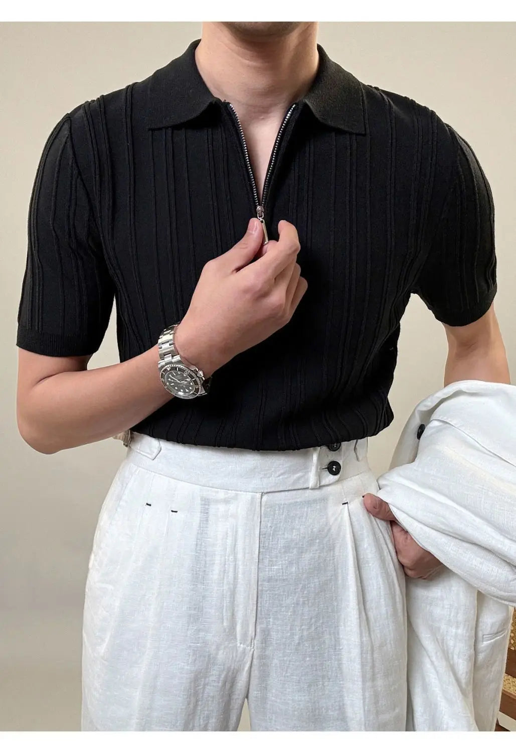 Riolio Zipper Knitted Short-sleeved Polo Shirt Men Summer American Retro Commuting Loose Vertical Striped Pit Strip Lapel T-shirt Men