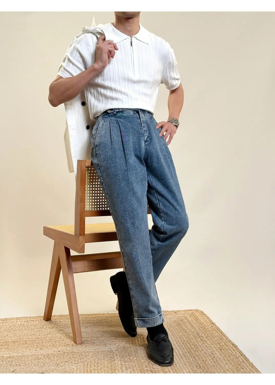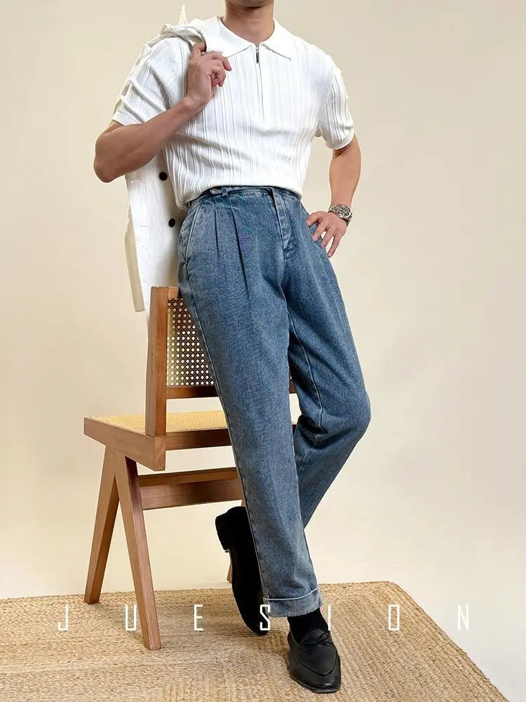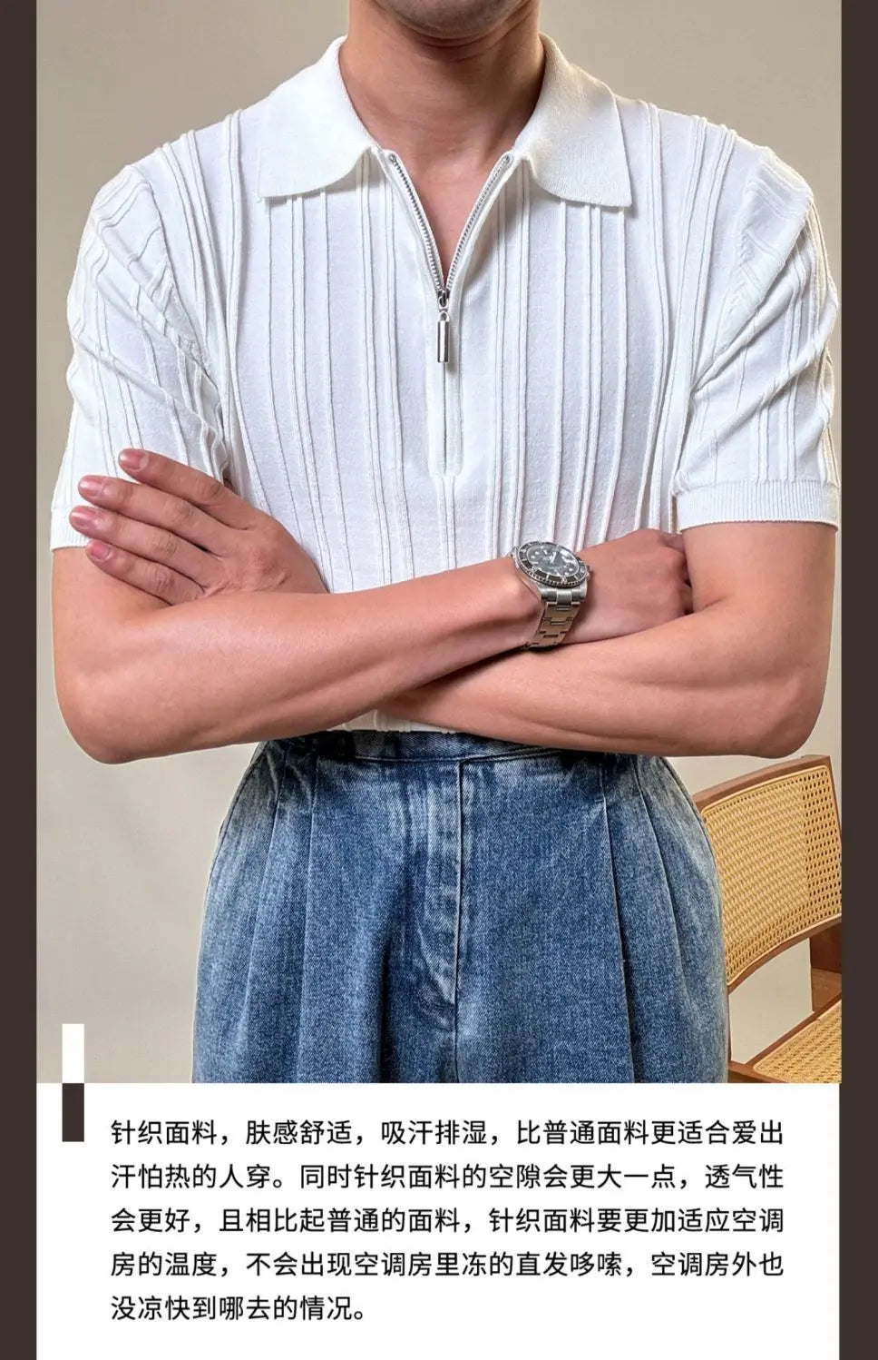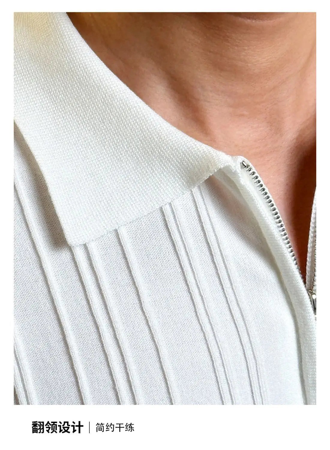 Riolio Zipper Knitted Short-sleeved Polo Shirt Men Summer American Retro Commuting Loose Vertical Striped Pit Strip Lapel T-shirt Men
