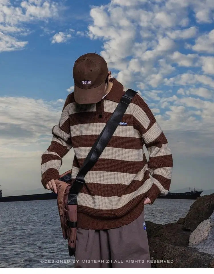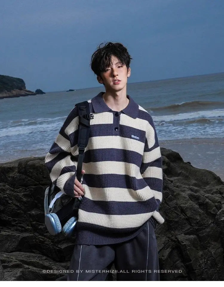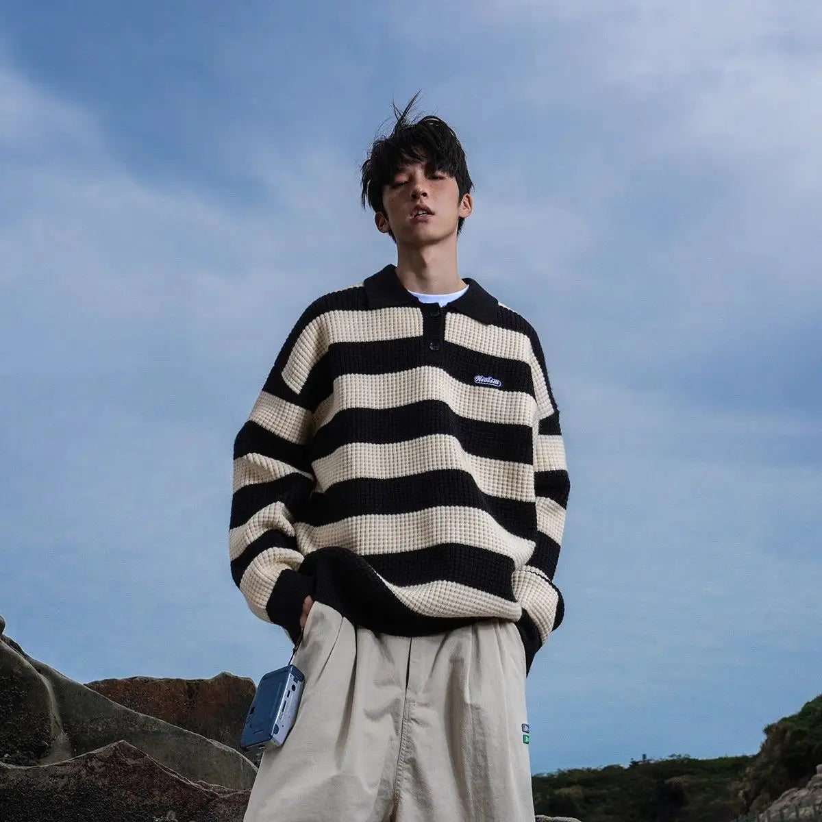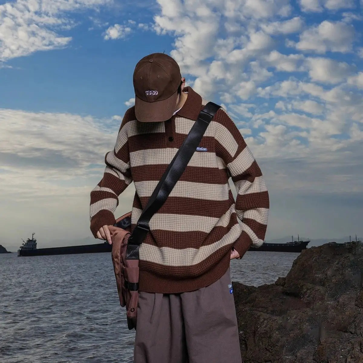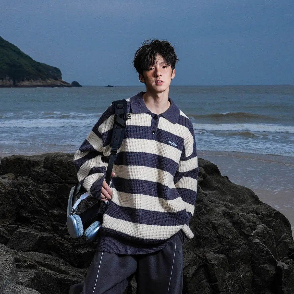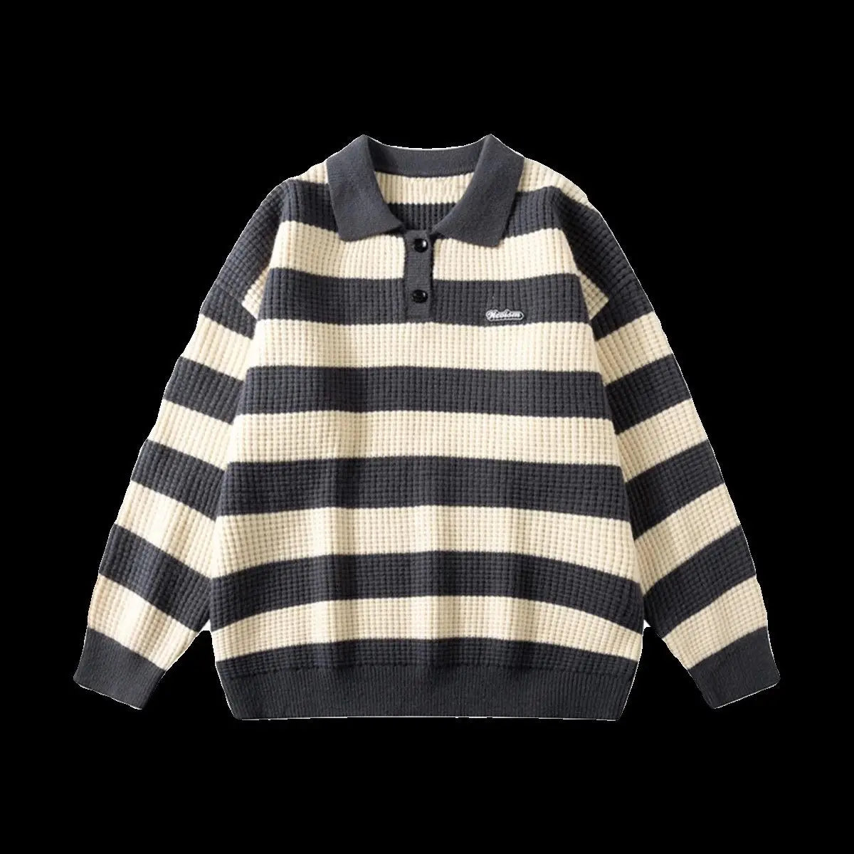Riolio American autumn and winter high street men and women trendy personalized striped lapel shirts for couples loose retro casual top