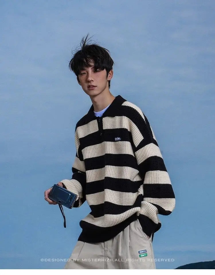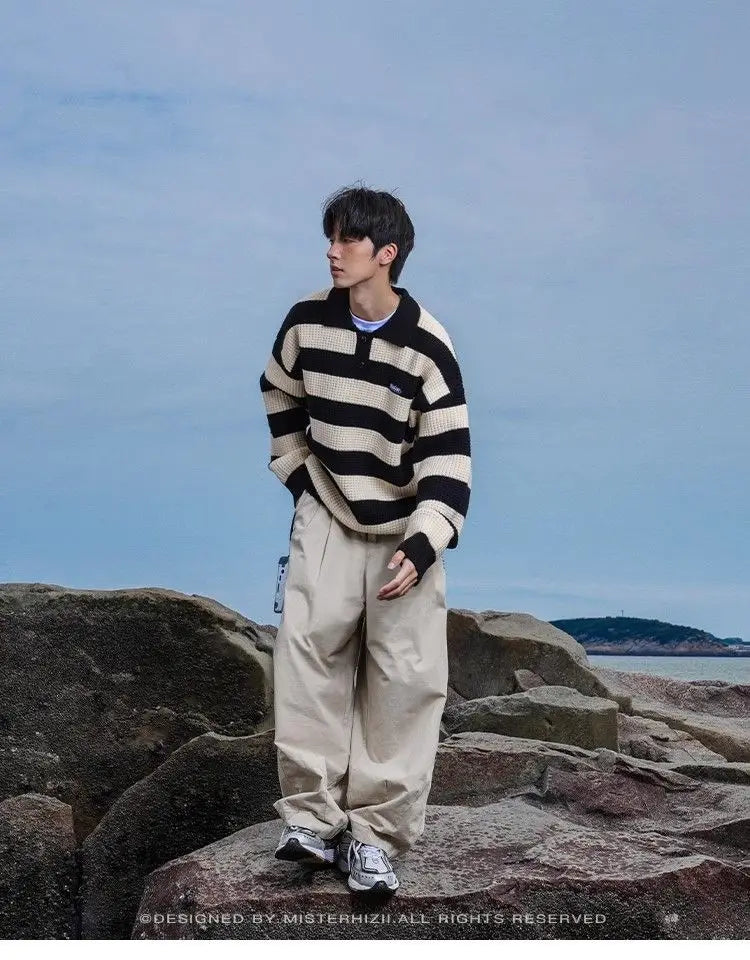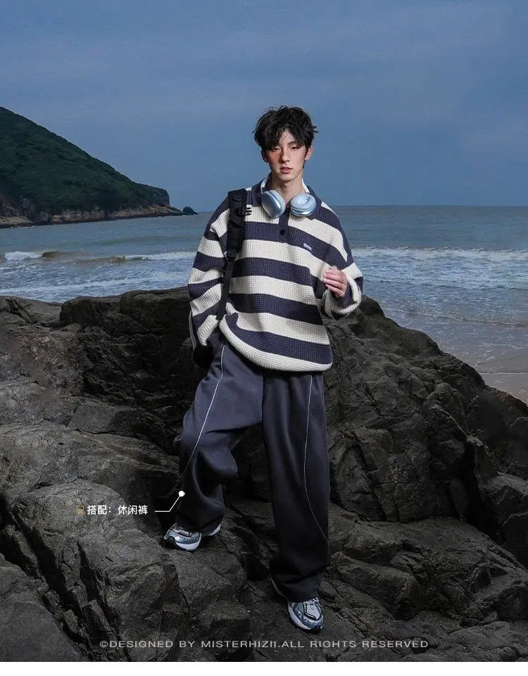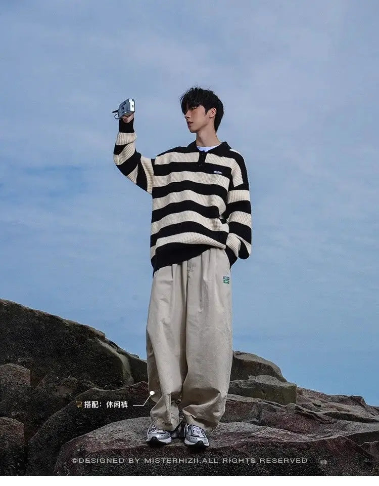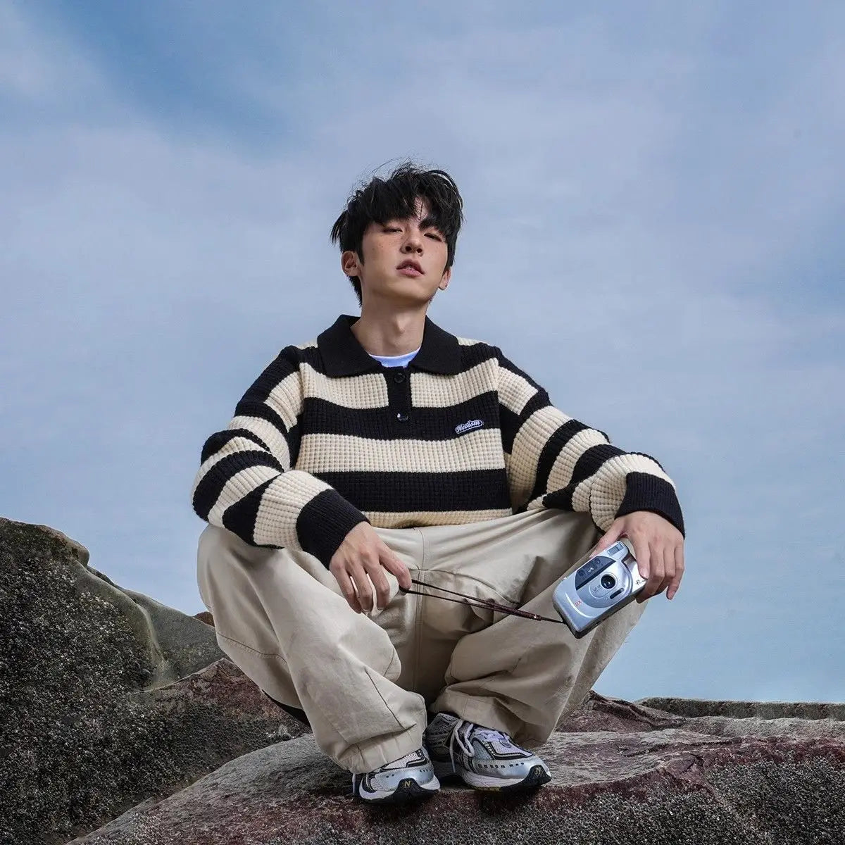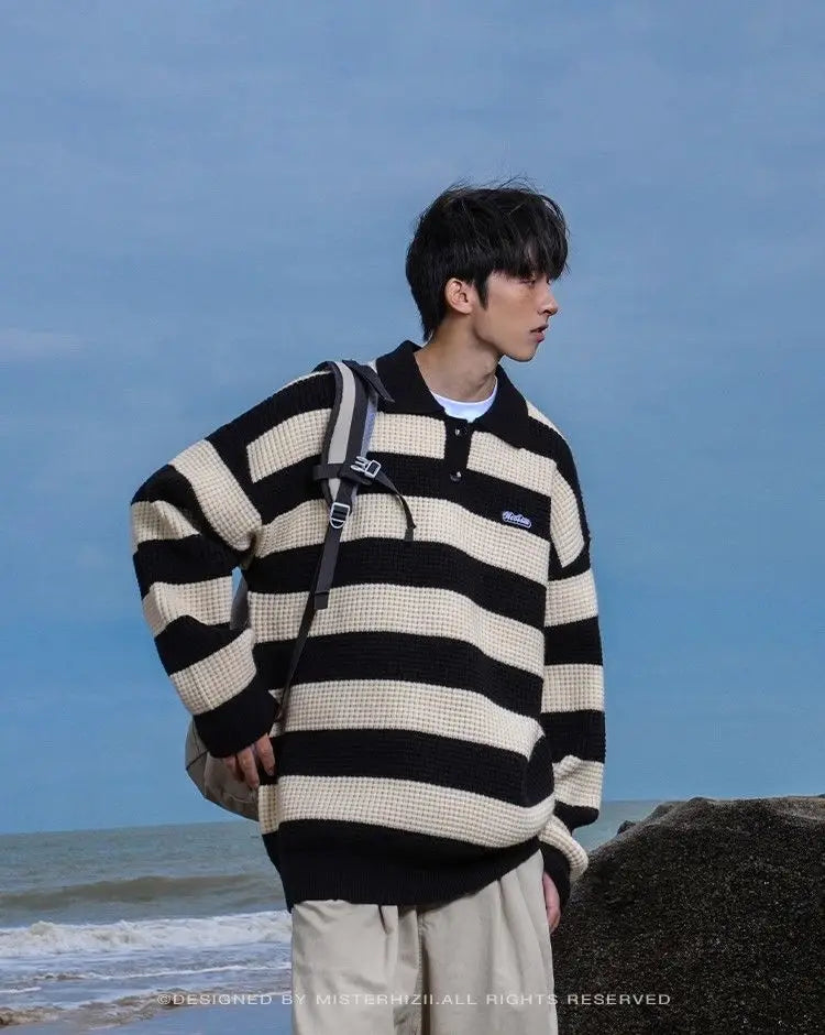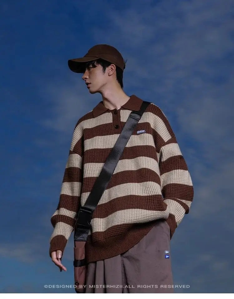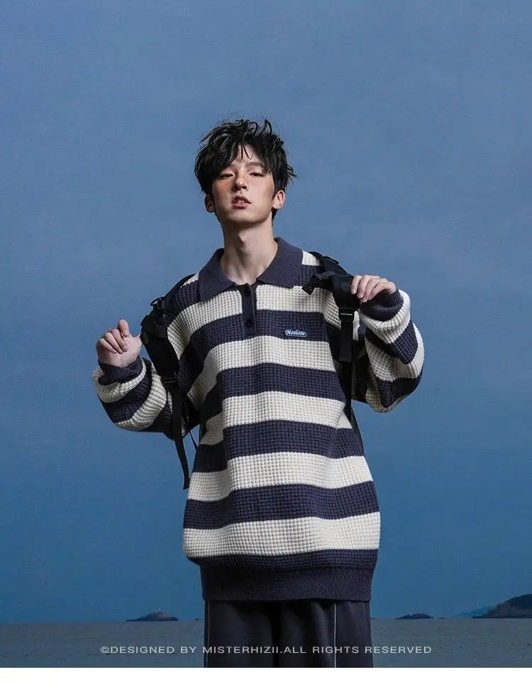 Riolio American autumn and winter high street men and women trendy personalized striped lapel shirts for couples loose retro casual top