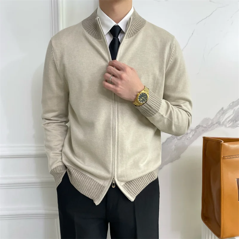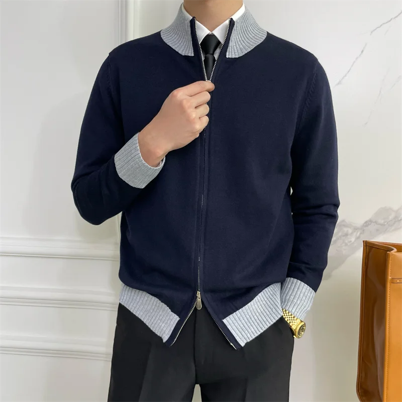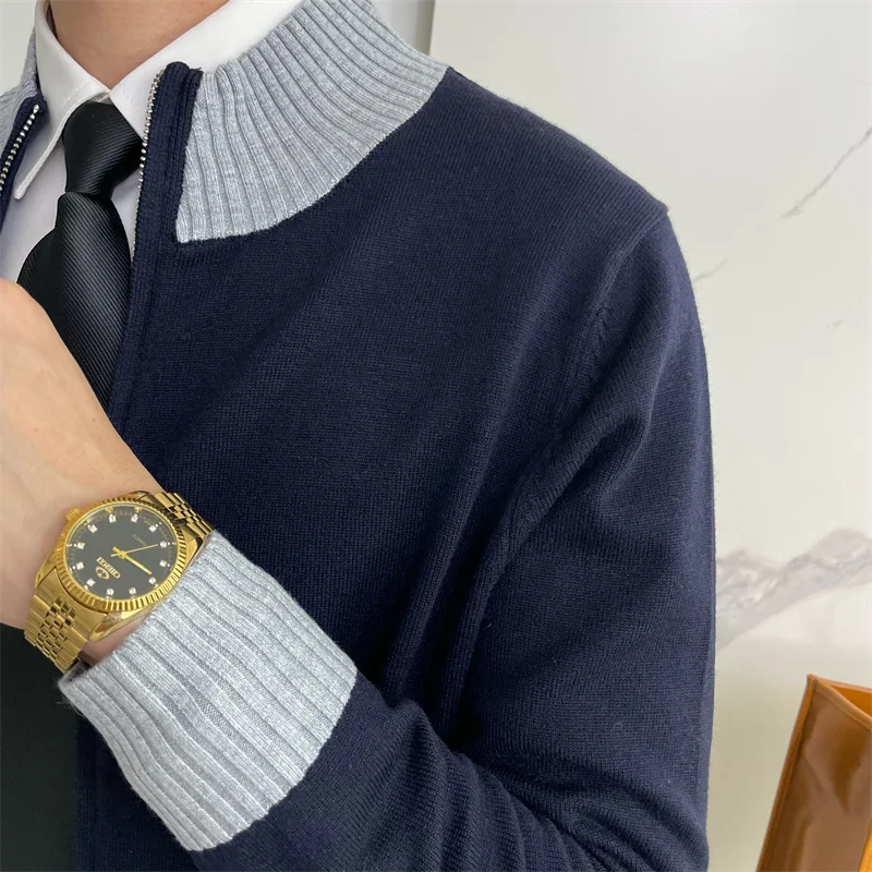 Riolio British Style Slim-fit Sweater with Stand-up Collar American Casual Color-blocked Zipper Cardigan Woolen Top Trendy Jacket Chic