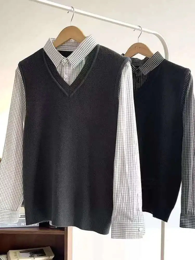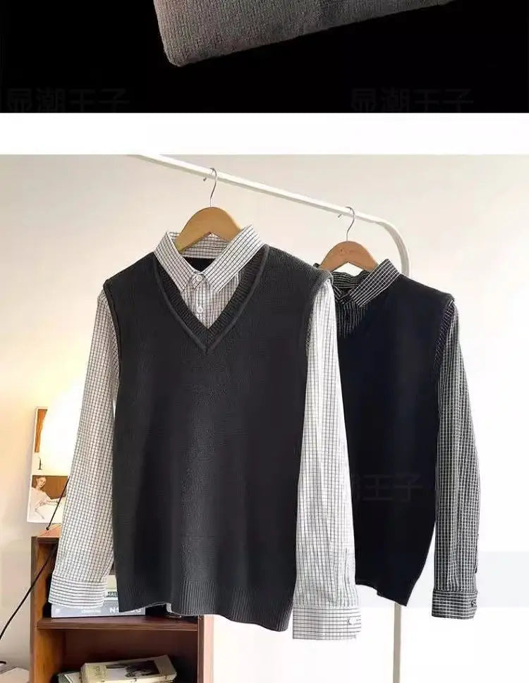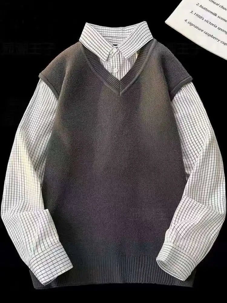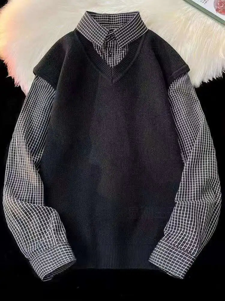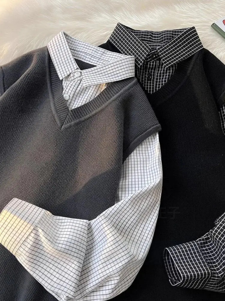 Riolio Japanese autumn and winter men and women trendy personalized fake two piece shirt sweater couple loose hip-hop casual top y2k