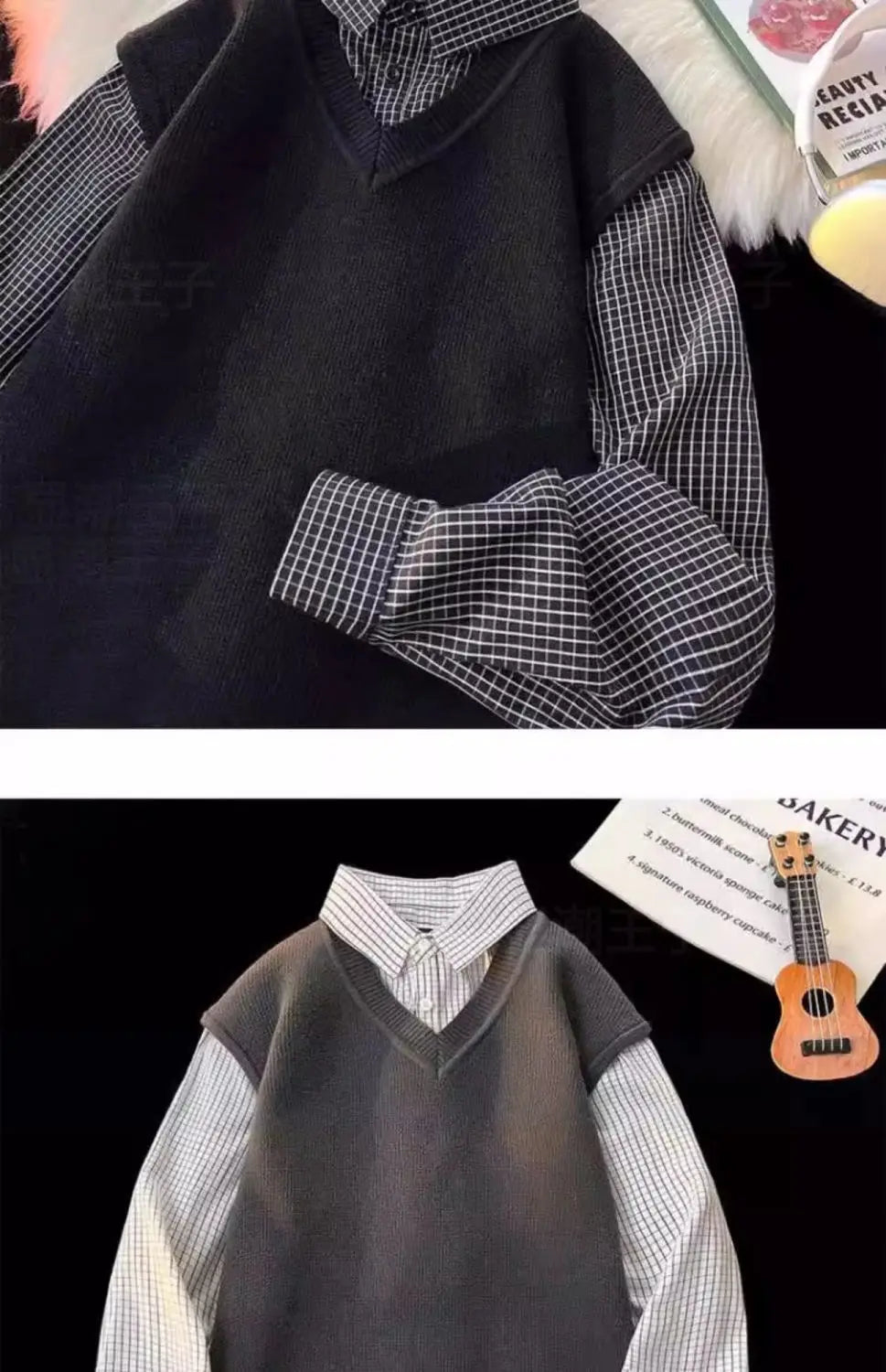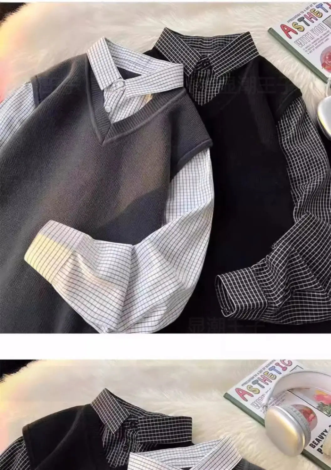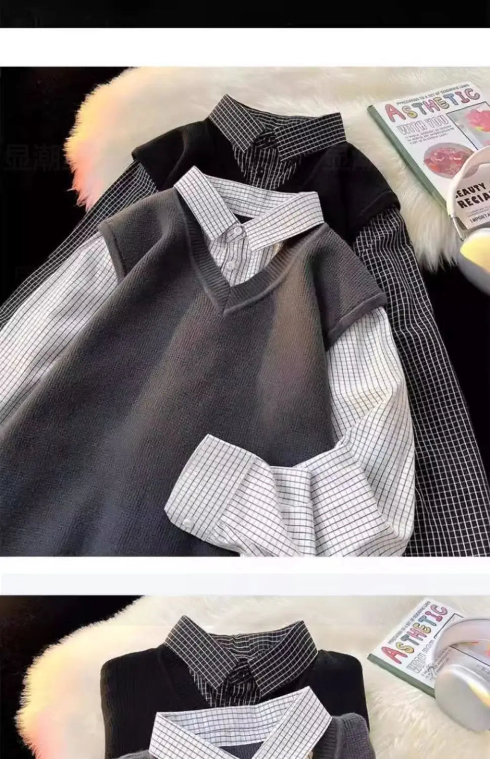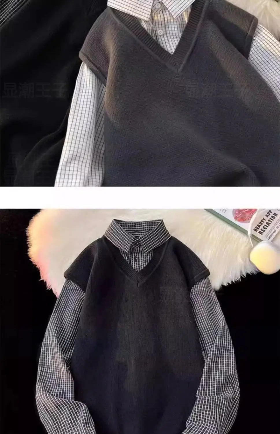 Riolio Japanese autumn and winter men and women trendy personalized fake two piece shirt sweater couple loose hip-hop casual top y2k