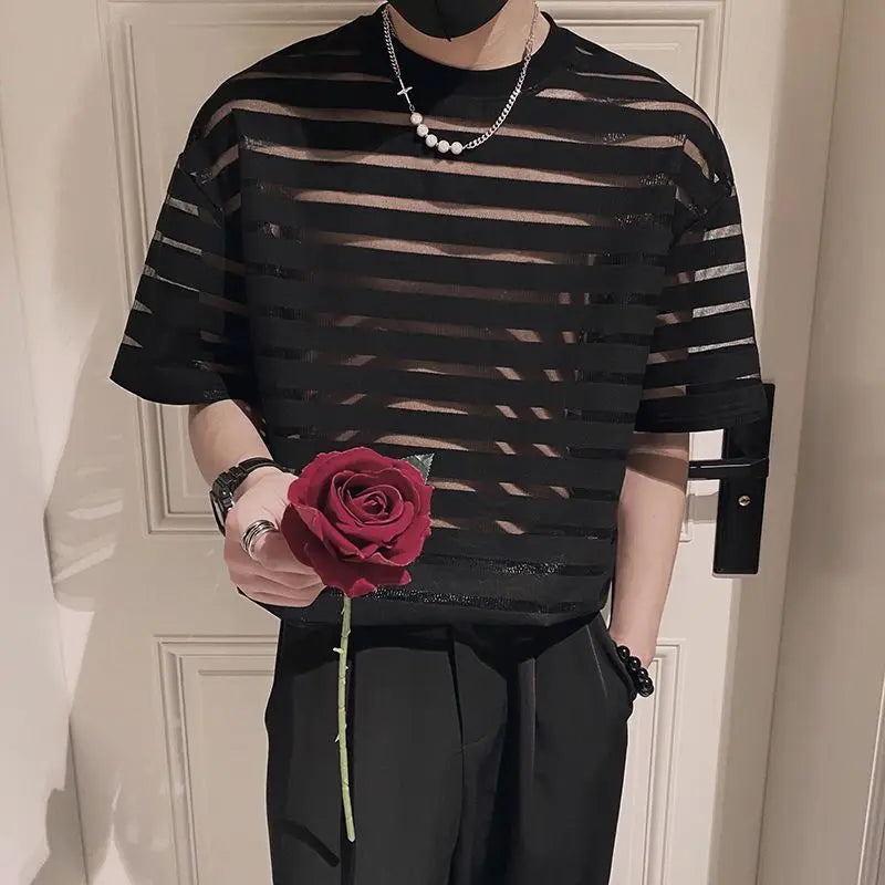 Riolio Korean New Men's Clothing Fashion Hollow Out Striped Tops Man Comfortable Breathable Lace Thin Style T-shirt