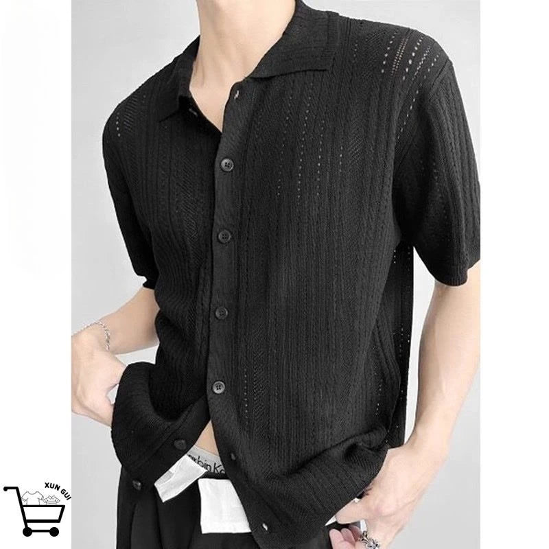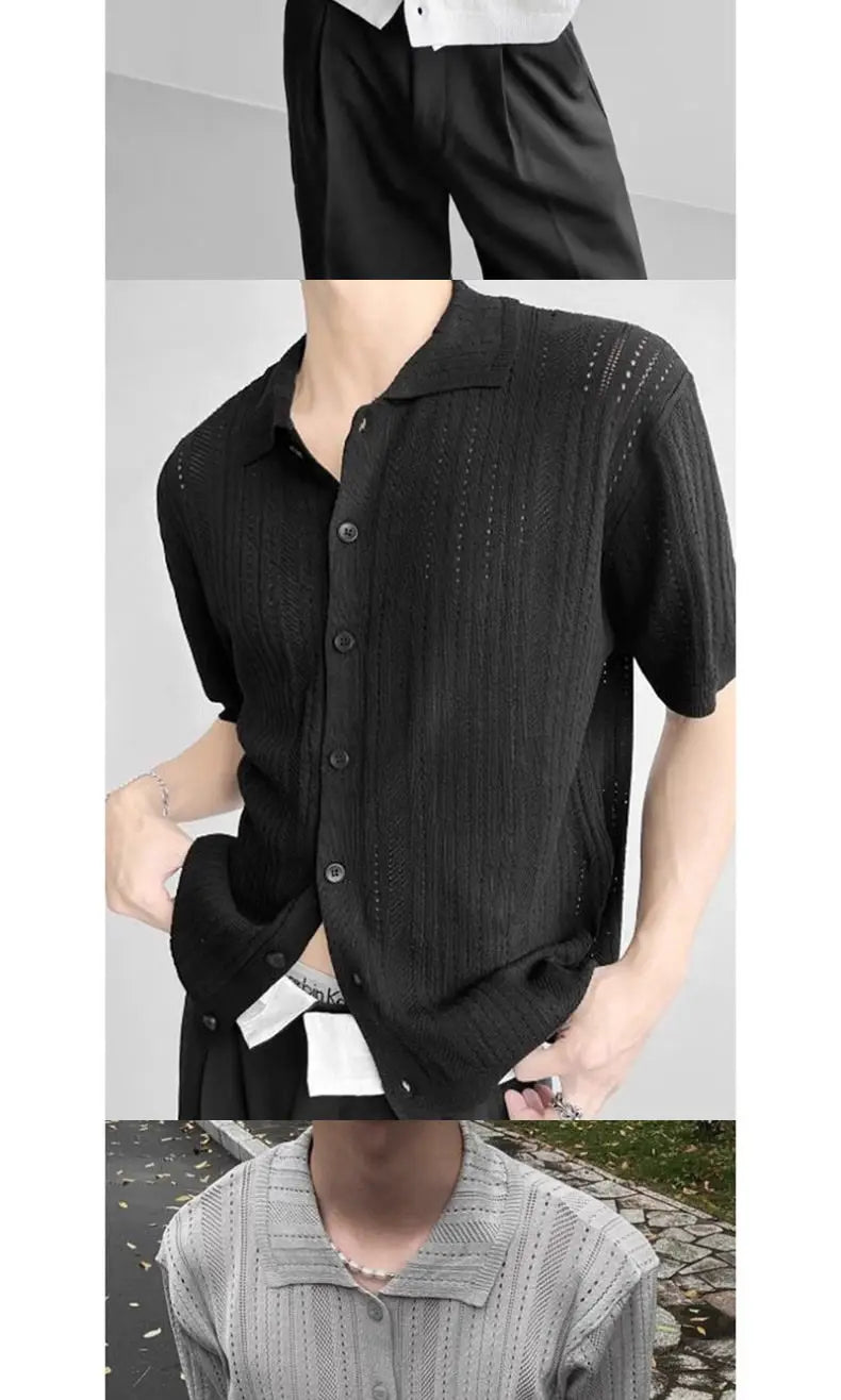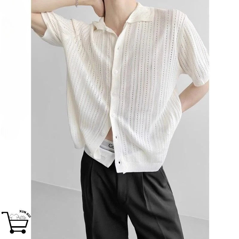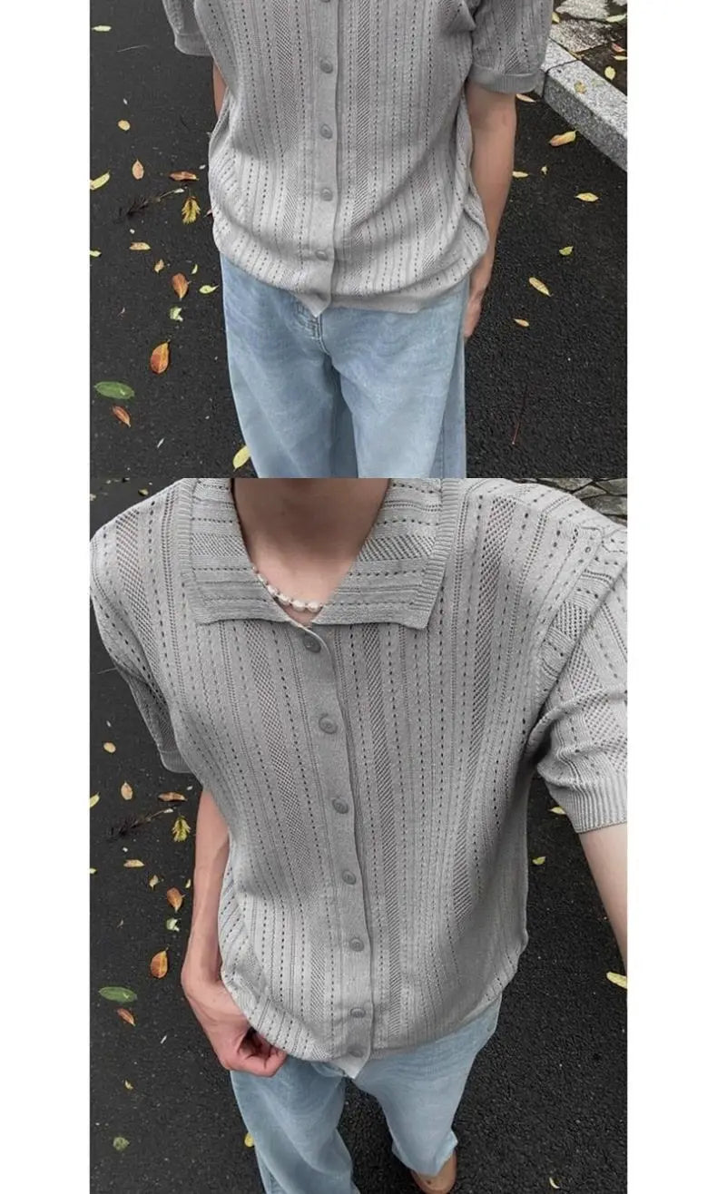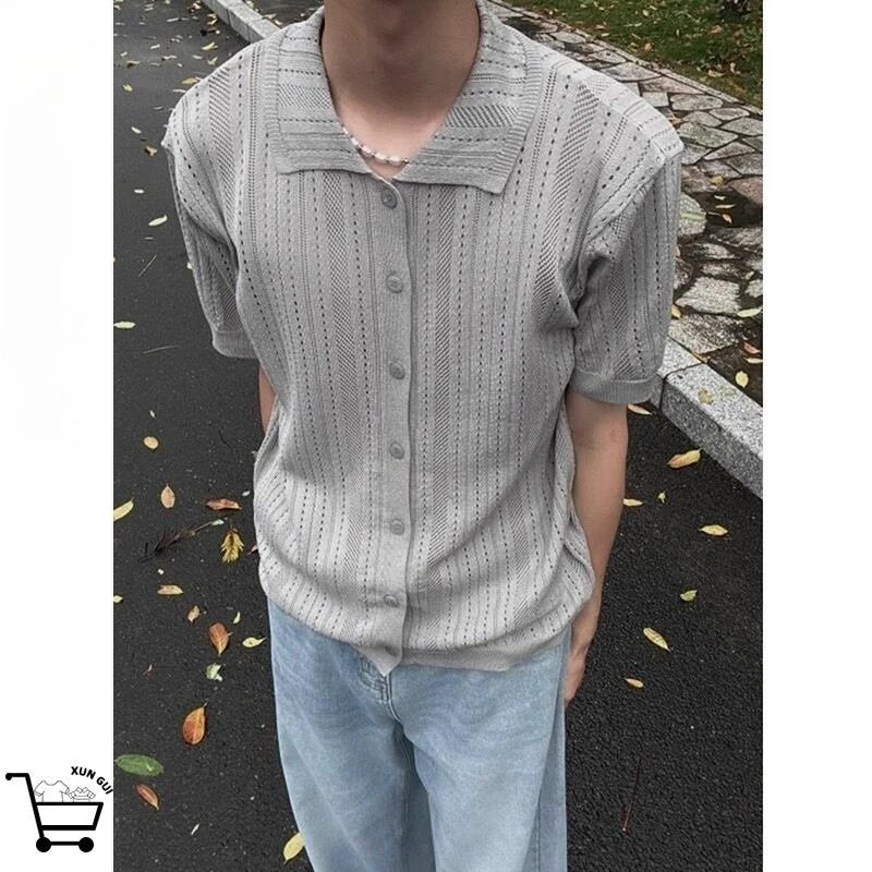 Riolio Korean style summer high street men and women hip-hop hollow knit collar short sleeved couple loose retro casual T-shirt top y2k
