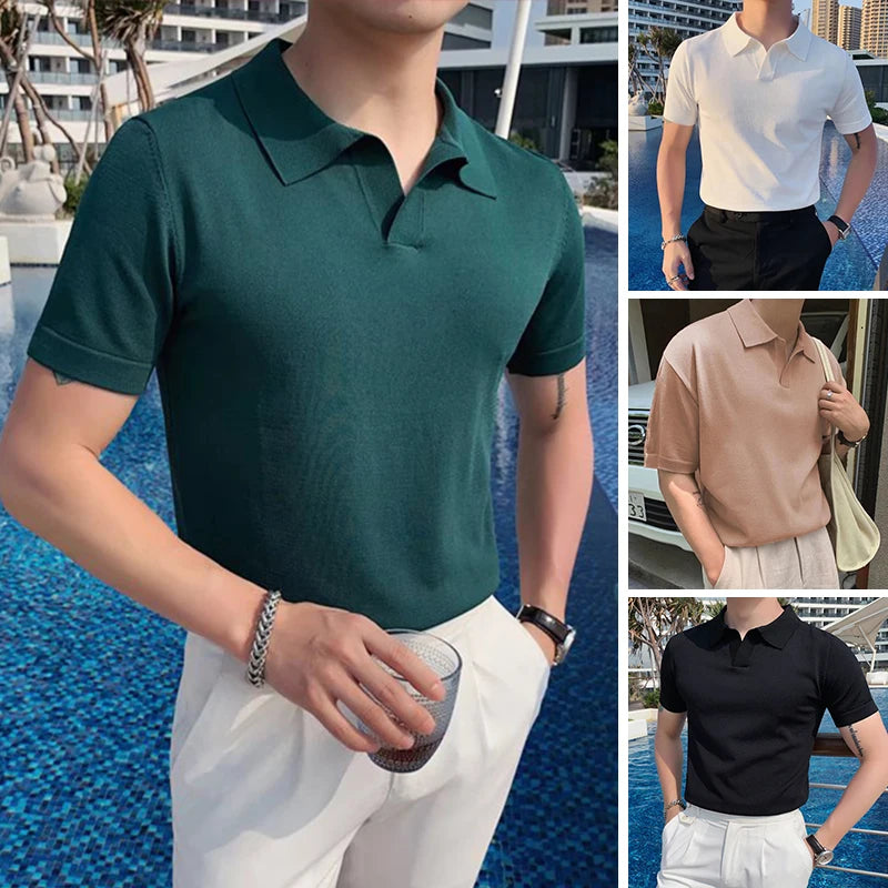 Riolio  Men V Neck Polo T Shirt Korean Fashion Polo Shirts Short Sleeve Casual Soild Top Slim Social Shirts Ice Silk T-Shirts Streetwear