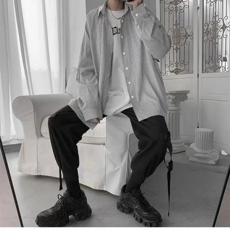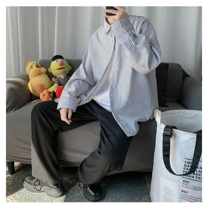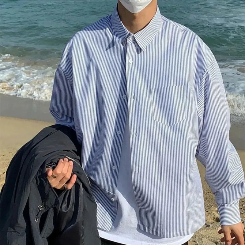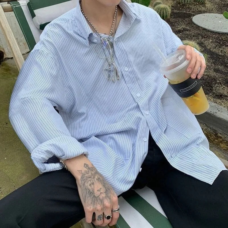 Riolio Men's Blue & White Striped Oversized Shirt Long Sleeve Collared Casual Loose Fit Top