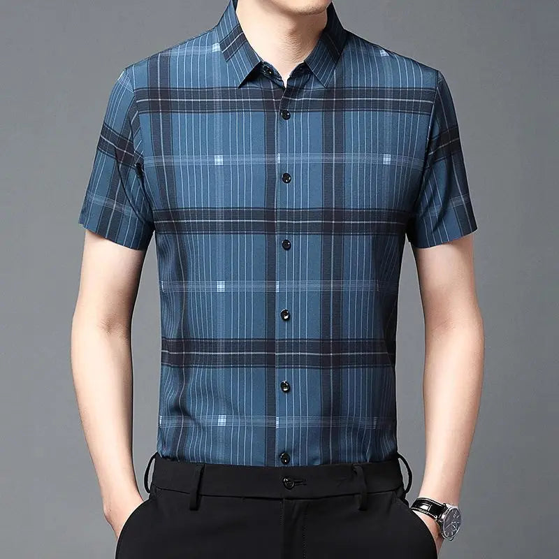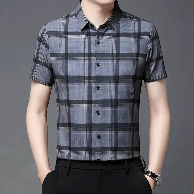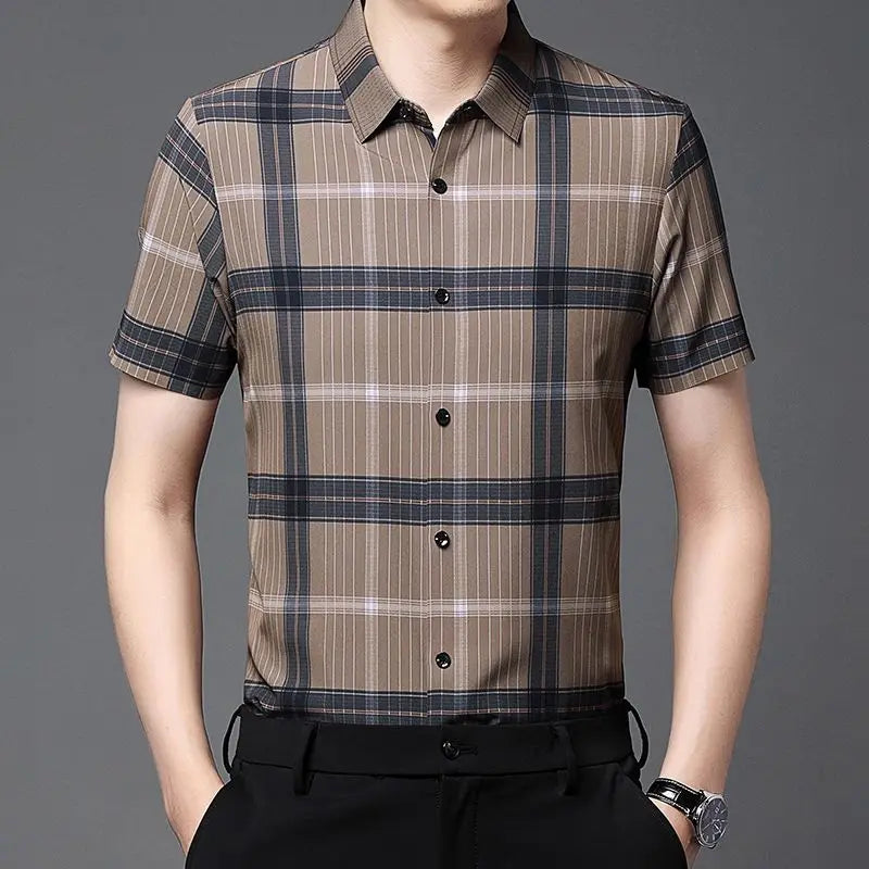 Riolio Men's Short Sleeved Shirt Summer Plaid Middle aged Business Casual Thin Top
