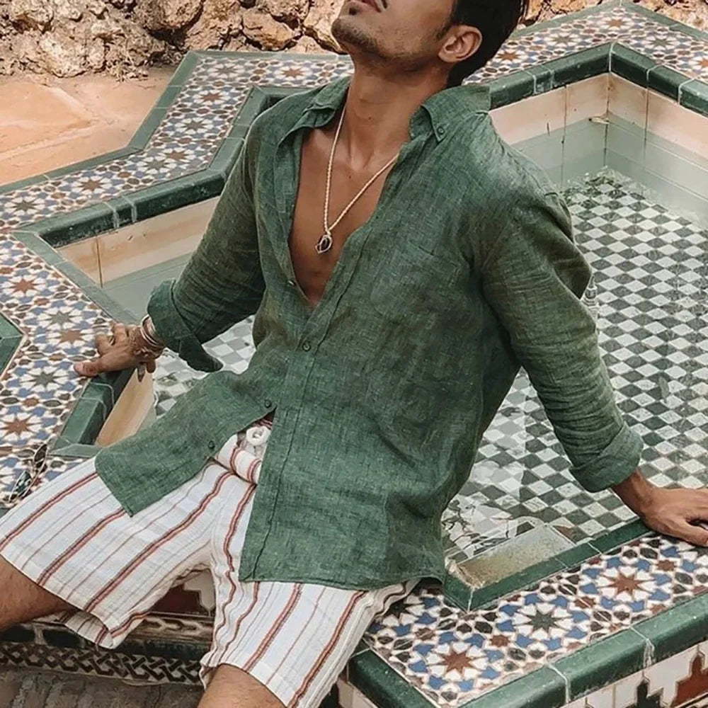 Riolio  Men's Spring Summer Lightweight Shirt Long Sleeve Simple Basic Style Shirts Turn-down Collar Single Breasted Beach Tops