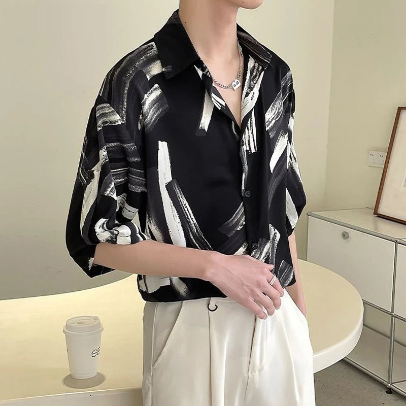 Riolio Men's Trendy Tie Dye Ink Print High Street Chic Button Up Shirt Summer Fashion Casual Short Sleeve Loose Tops Camisas De Hombre