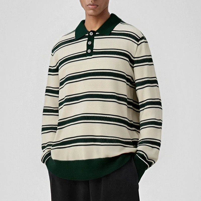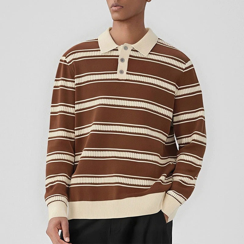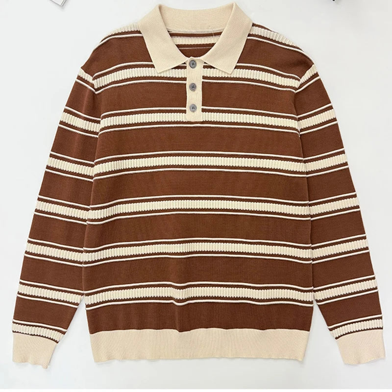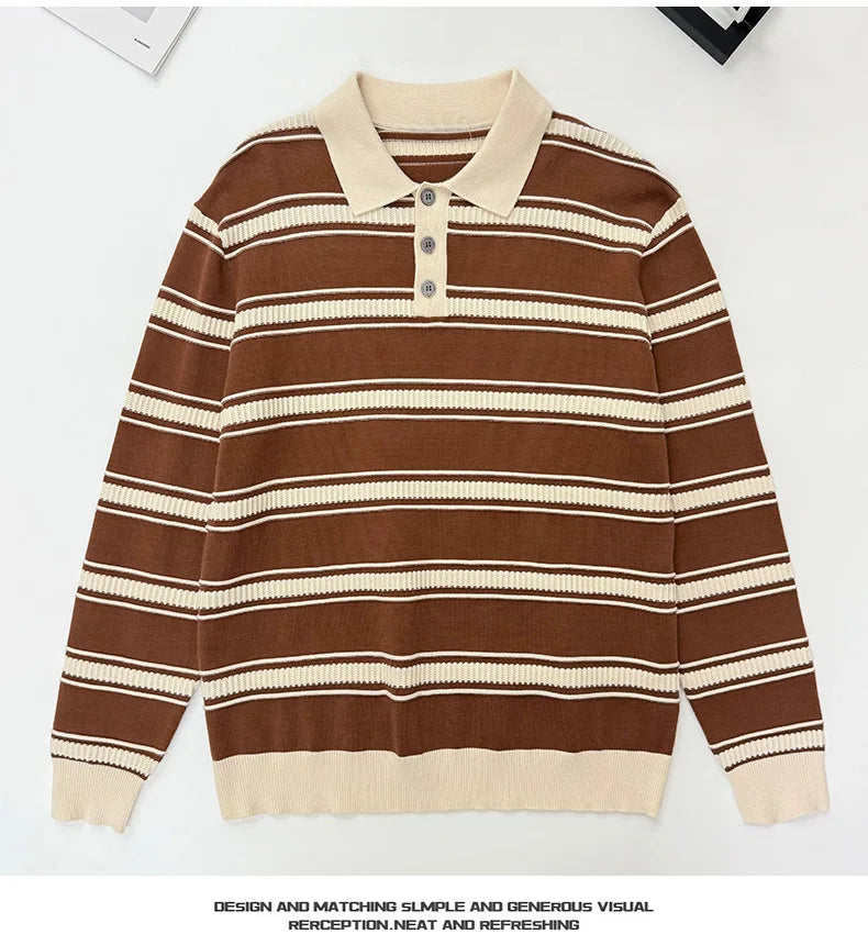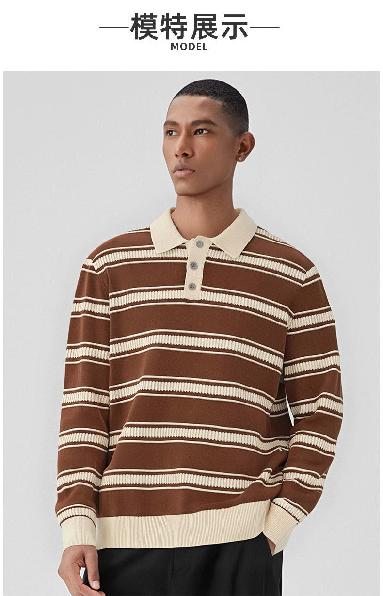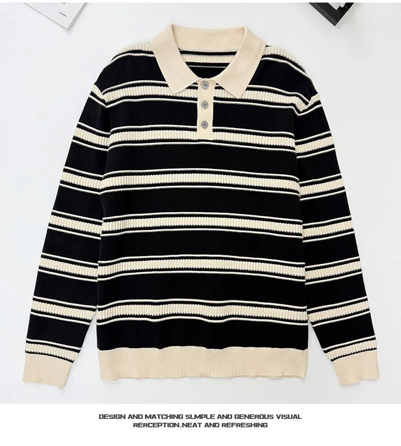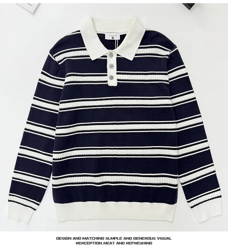 Riolio New American Trendy Men Polo Neck Sweater Light Luxury Striped Knit Long Sleeve Pullover Tops High Quality Loose Knitwear M-3XL