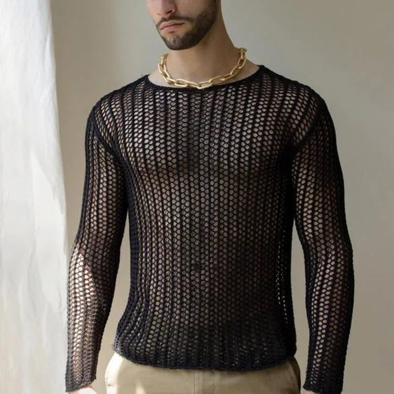 Riolio Sexy Fashion Style Tops Handsome Men's Hollowed Slightly Perspective T-shirt Leisure Club wear Thin Long Sleeved Camiseta