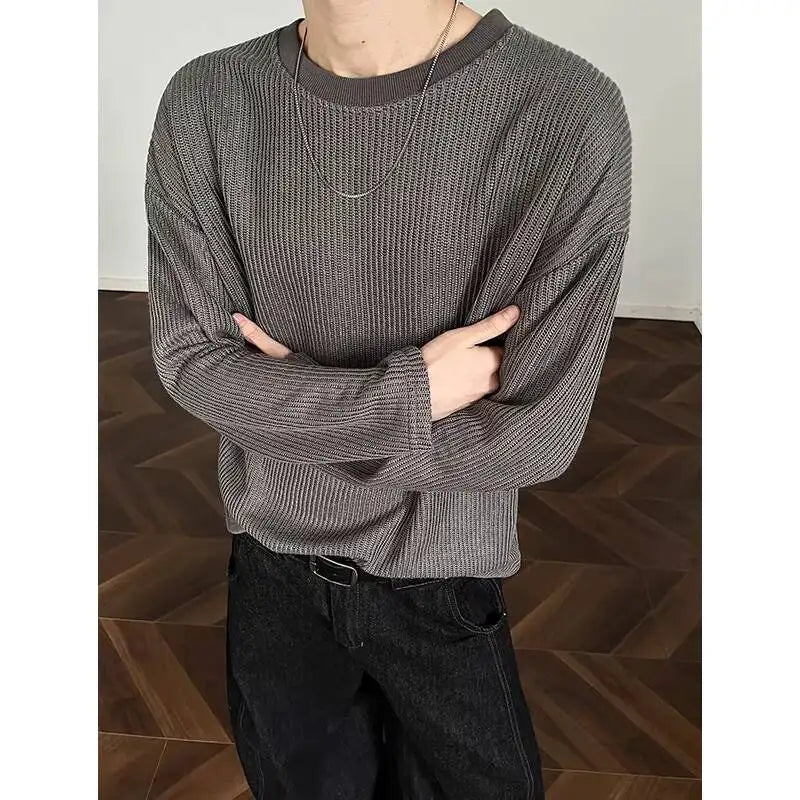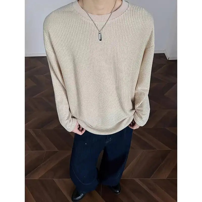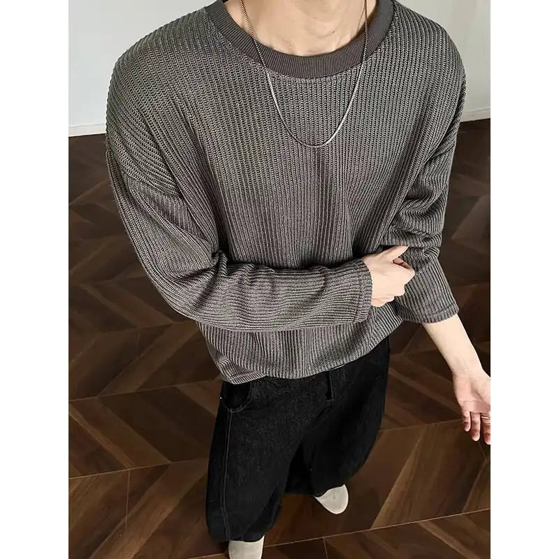 Riolio Spring Long Sleeved T-shirt Men Fashion Black Casual Knitted T-shirt Men Streetwear Korean Loose Pleated T Shirt Mens Tops