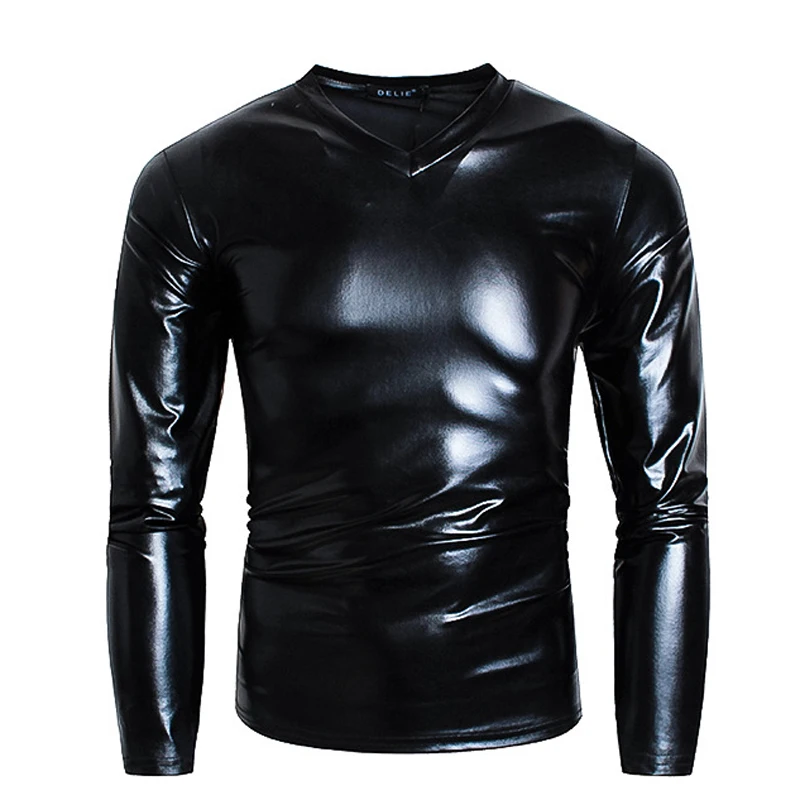 Riolio Men's V Neck Sliver Metallic Shiny T Shirt Disco Nightclub Prom Long Sleeve Tshirt Homme Hip Hop Halloween Carnival Streetwear