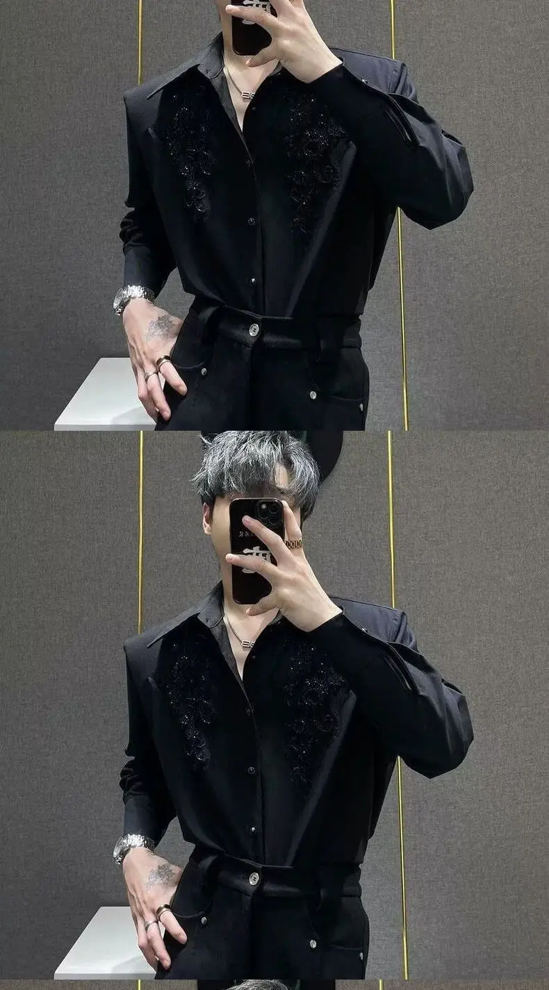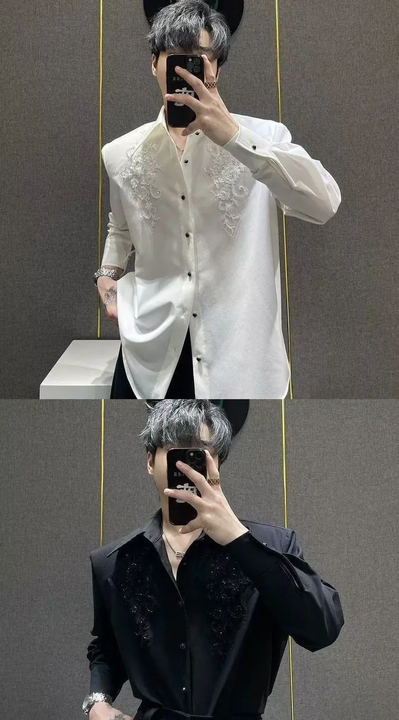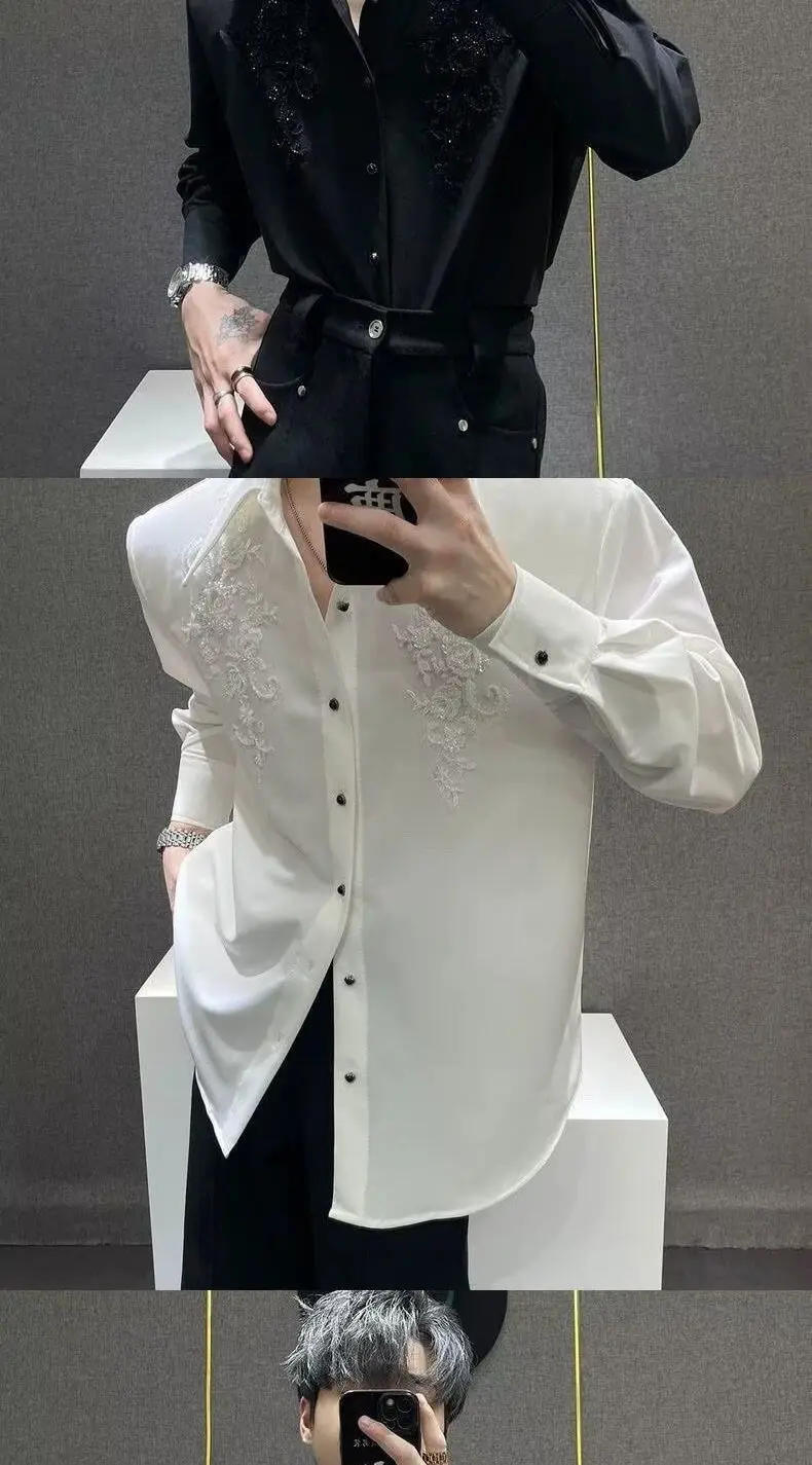Riolio Men's Black Long Sleeve Turn-Down Collar Shirt Sequin Embellished Chest Loose Fit Party Blouse