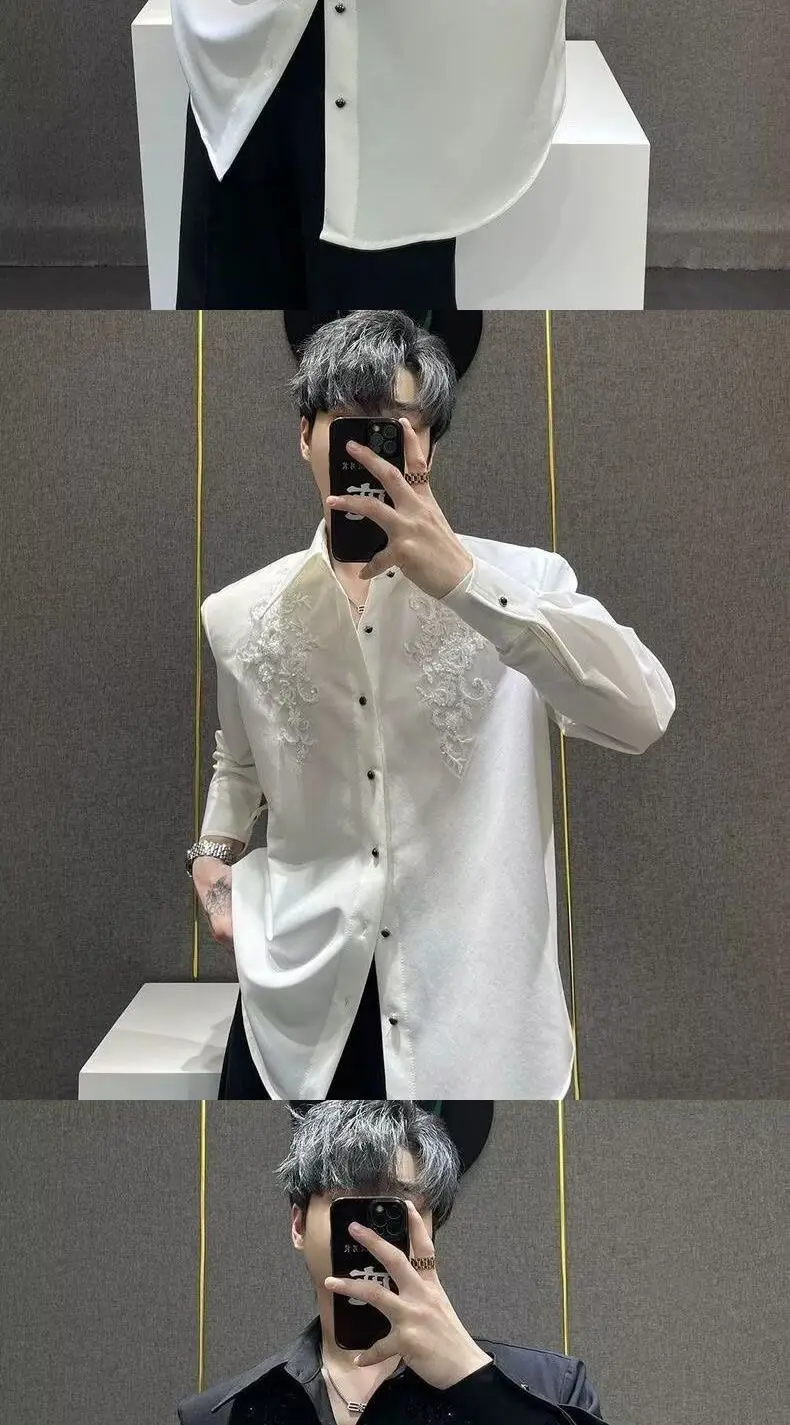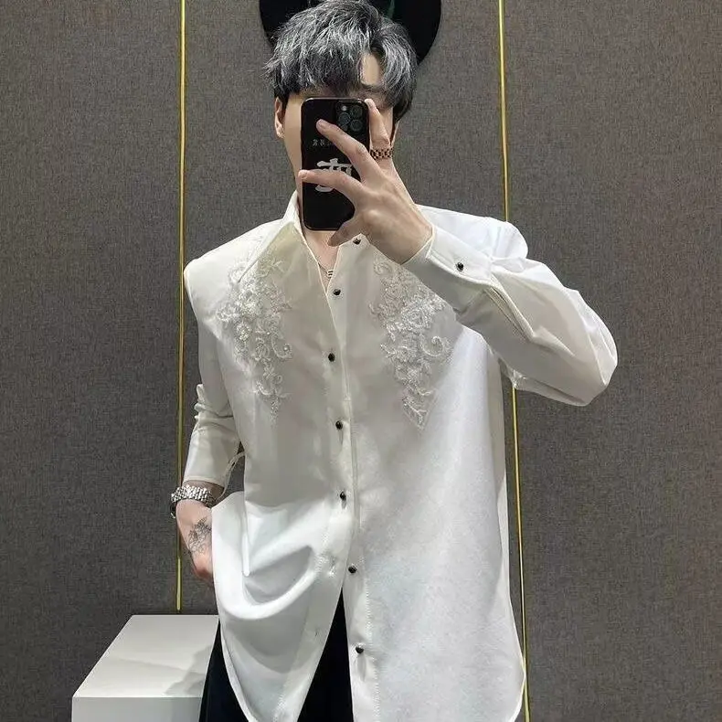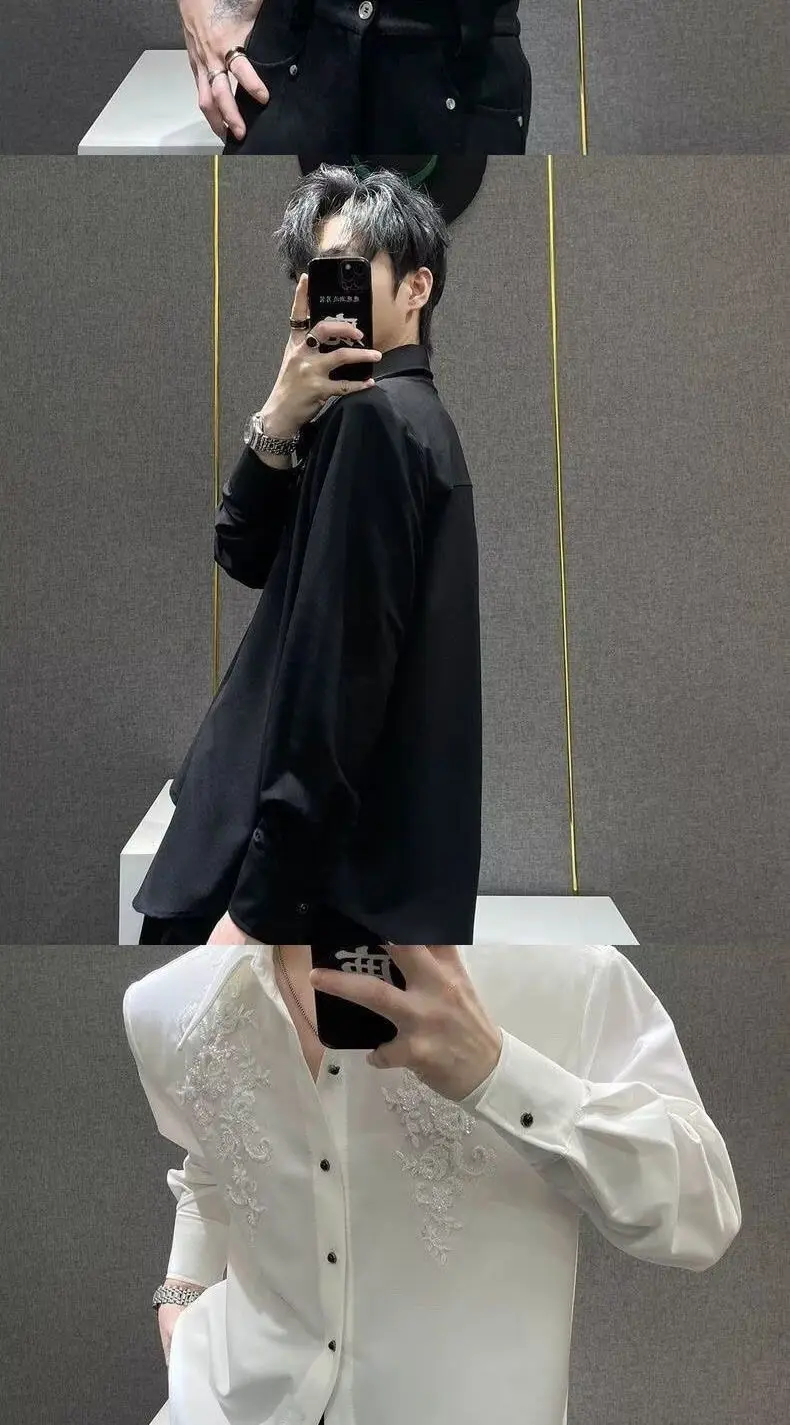 Riolio Men's Black Long Sleeve Turn-Down Collar Shirt Sequin Embellished Chest Loose Fit Party Blouse